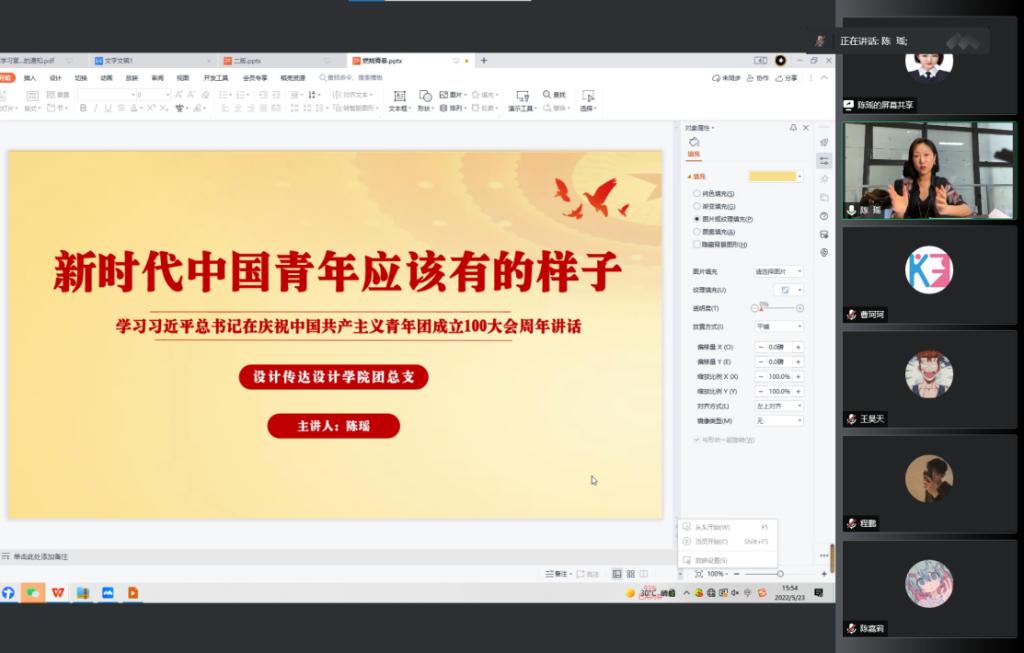 5月23日,视觉传达设计学院团总支副书记陈瑶面向上半年党员发展对象、入党积极分子,以“青年应有的样子”——学习“习近平总书记在庆祝中国共产主义青年团成立100周年大会上的重要讲话”精神为主题,开展线上专题宣讲。