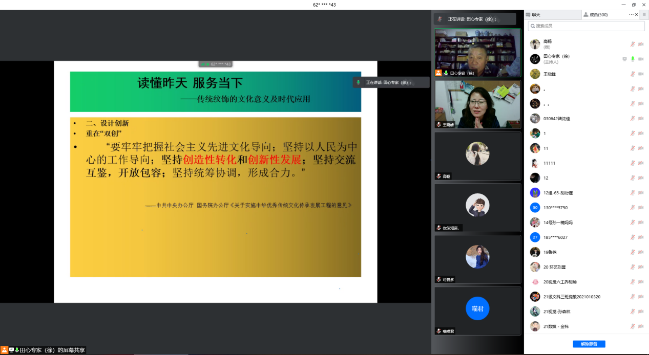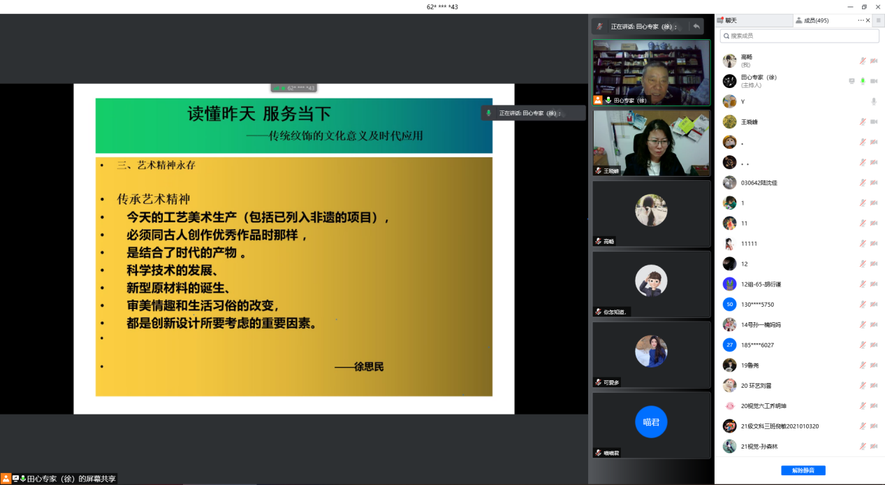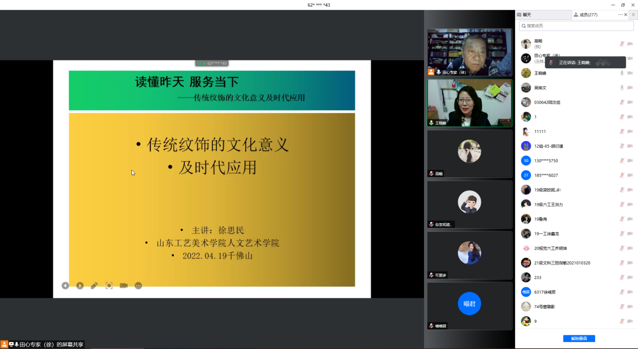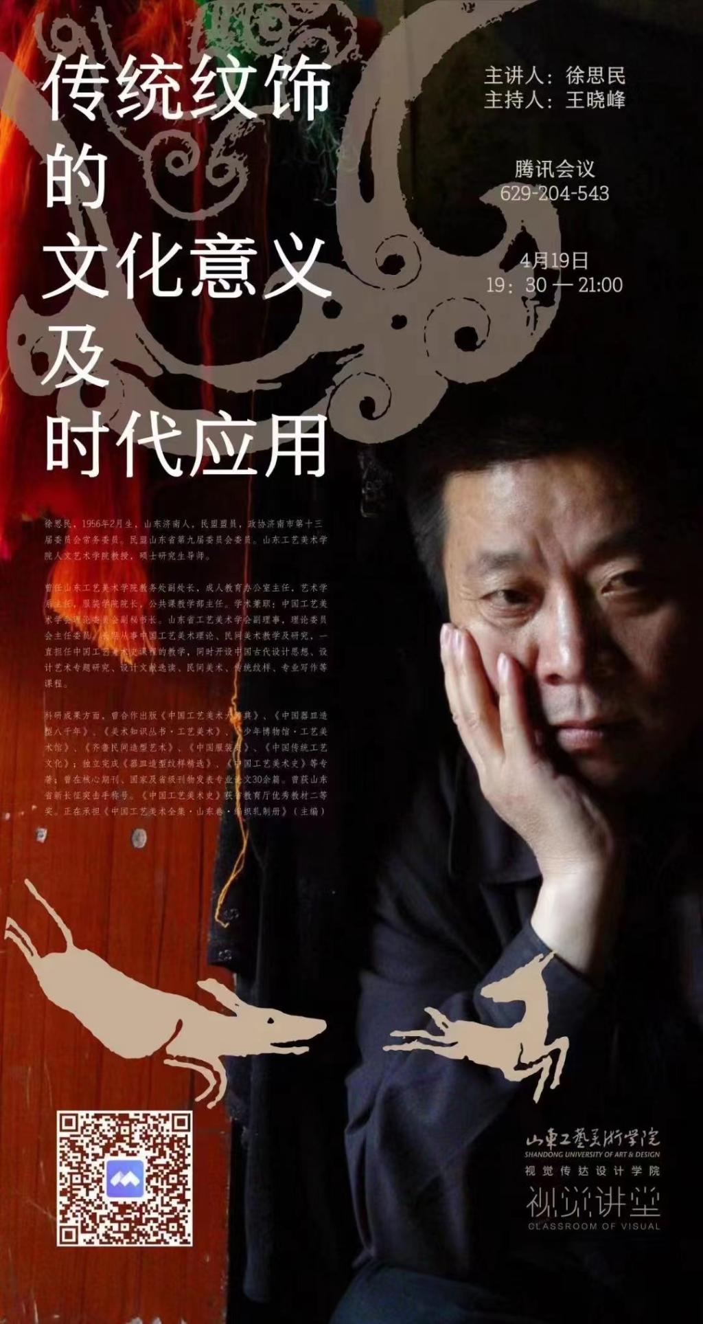 4月19日晚,为传承和弘扬优秀传统文化,增强文化自信,提高我院师生专业素养,提升设计水平,视觉传达设计学院邀请徐思民教授举办《读懂昨天,服务当下——传统纹饰的文化意义及时代应用》专题云讲座。院长王晓峰主持讲座。