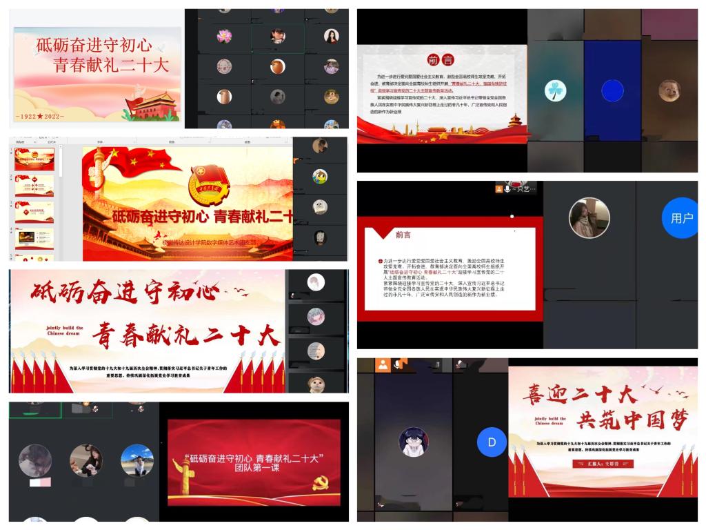 2022 年是党的二十大召开之年,是中国共产主义青年团建团 100 周年。为深入学习贯彻党的十九大和十九届历次全会精神,贯彻落实习近平总书记关于青年工作的重要思想,持续巩固深化拓展党史学习教育成果,教育引导广大团员青年坚定不移听党话、跟党走,庆祝建团100 周年,以奋发向上的精神状态迎接党的二十大胜利召开,3月21日至4月10日间,视觉传达设计学院团总支、各团支部以线上形式开展“砥砺奋进守初心 青春献礼二十大”团队第一课。