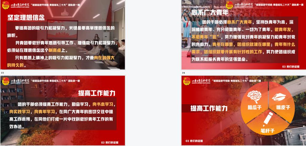 视觉团总支副书记陈瑶面向全院团干部主讲线上团课。团课中,陈老师带领大家一起学习了习近平总书记关于青年工作的重要思想,指出推动共青团事业不断开创新局面,团干部要做到“四个必须”——必须坚定理想信念、必须心系广大青年、必须提高工作能力、必须锤炼优良作风。希望视觉团干部队伍能增强使命感、责任感和凝聚力,带领广大青年努力成为可堪大用、能担重任的栋梁之才。
