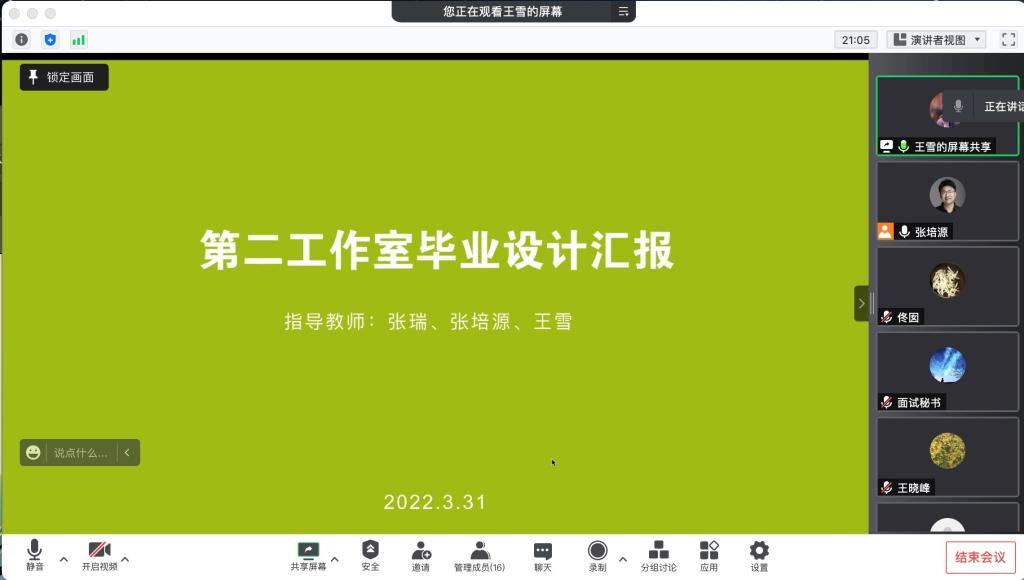 随后,各工作室毕业设计指导教师充分展示并详细讲述了到目前为止毕业设计的进展情况。王晓峰院长指出,疫情防控期间,毕业论文和毕业创作(设计)工作要坚持推进,坚决不能影响毕业整体工作,真正做到“停课不停学”。各毕业班指导教师在督促毕业生完成毕业作品的同时,需要积极关注学生的心理健康。