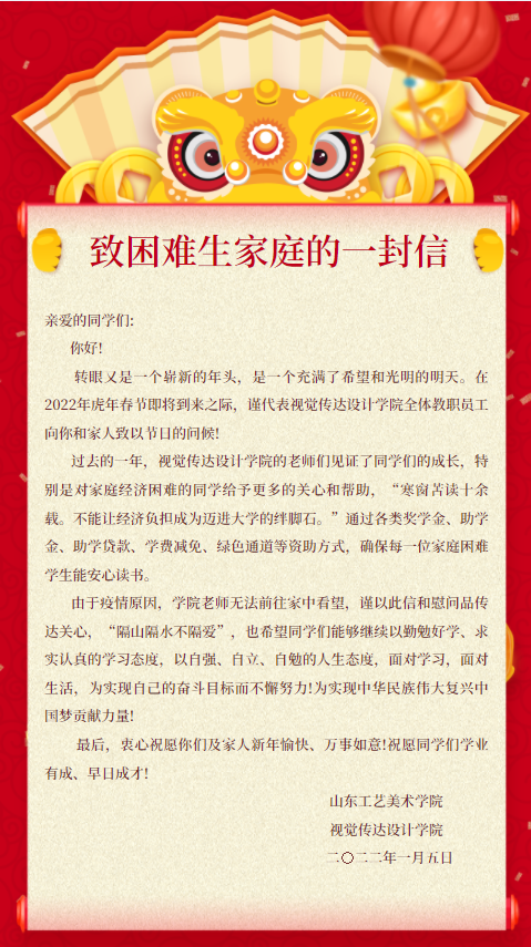 同时,视觉学院学生会为困难同学制作了线上家访信,辅导员老师将其发送给学生及家长,表达学院领导和学校的慰问,并着重宣传了党和政府对大学生的资助政策,鼓励同学们对未来生活学习要充满信心,自强自立改变家庭现状,回报国家和社会的帮助。