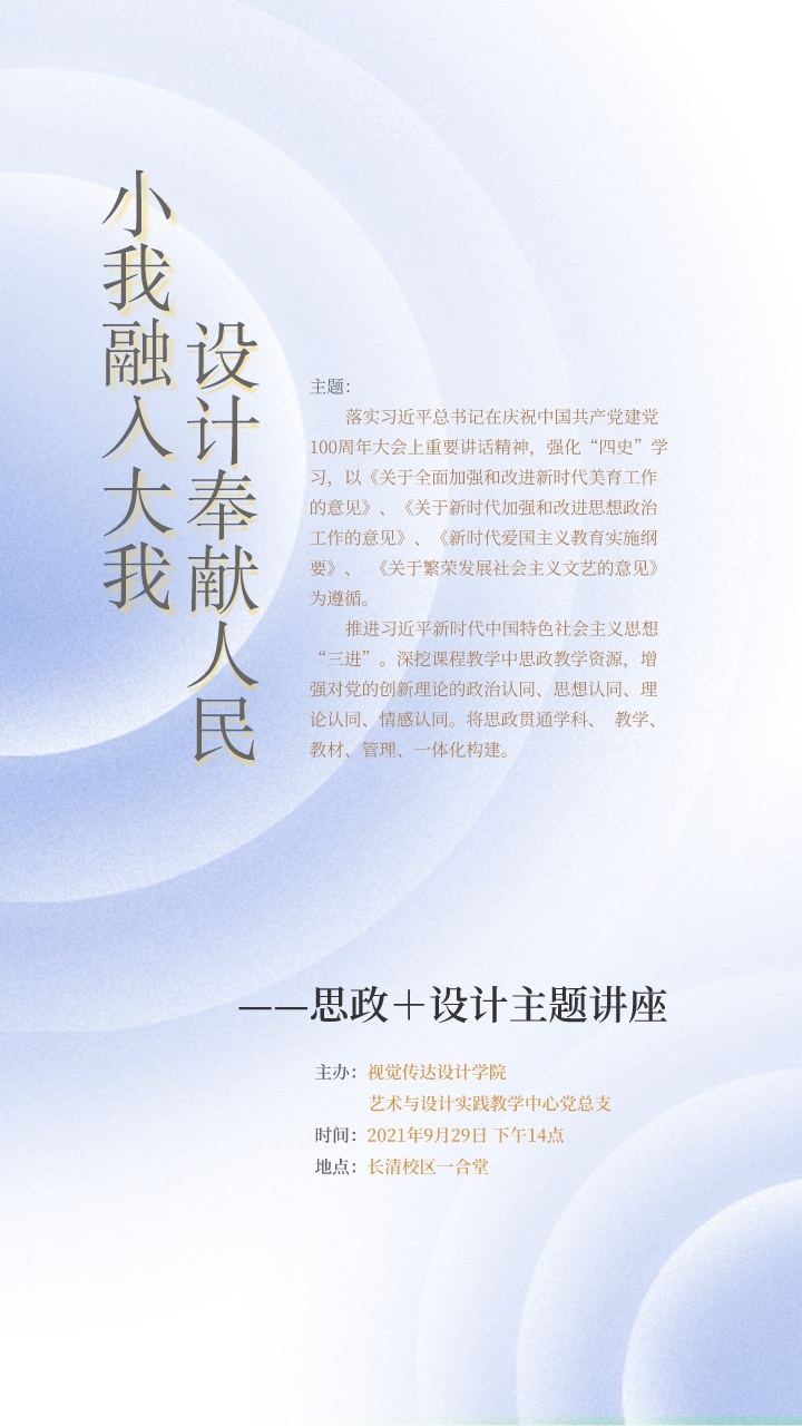9月29日,“思政+设计”新生入学教育“小我融入大我设计奉献人民”主题公开课在长清校区举办。活动由视觉传达设计设计学院、艺术与设计实践教学中心党总支共同主办。
