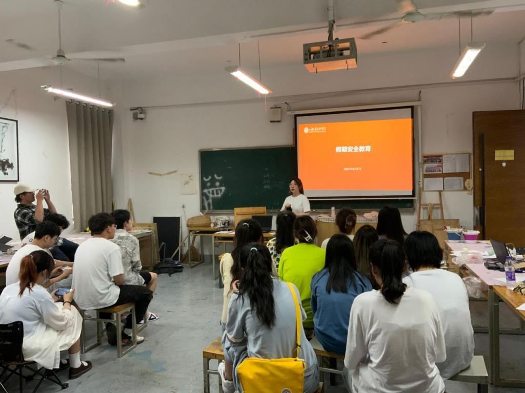 首先,辅导员高畅进入班级对同学们进行了假期安全教育。临近假期,要求同学们在校期间要严格请销假制度,重视宿舍安全问题、杜绝宿舍安全隐患、禁止外宿及私自在校外租房,严禁在校内外有酗酒行为发生。假期外出期间要做好自我防护,加强自我防范意识,此外还要求同学们要注意防诈骗、心理健康、疫情防护和按时返校等问题。