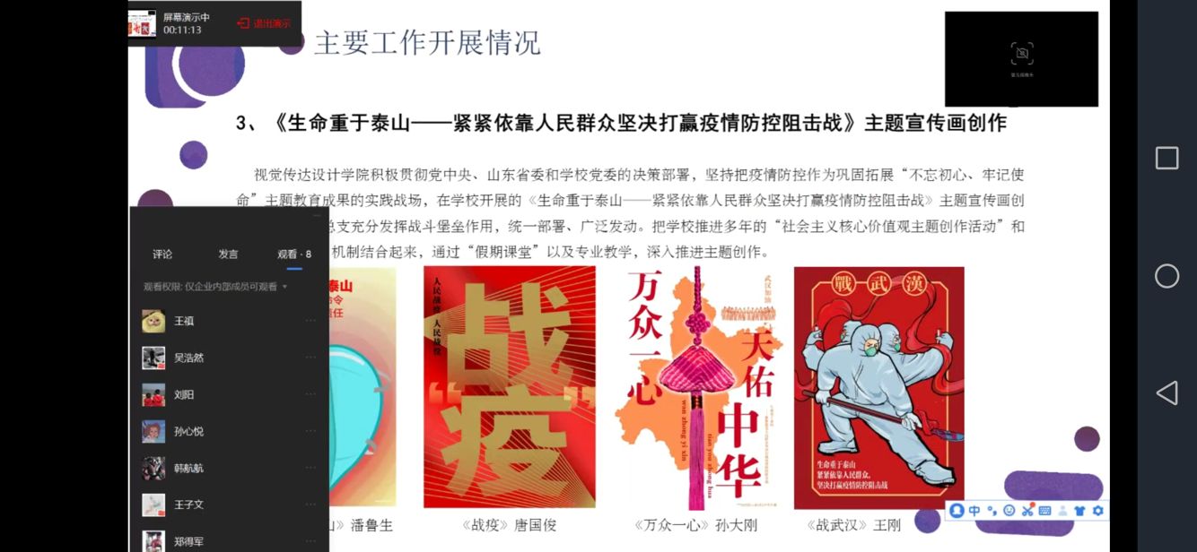 此次活动主要从三方面展开,一是视觉传达设计学院疫情防控工作;二是同学们返校应注意的事项;三是返校后的生活和要求。首先,王敏老师对于“视觉传达设计学院疫情防控工作”做了主要介绍,此次疫情,视觉传达设计学院党总支充分发挥基层战斗堡垒作用,为学校疫情防控做出了巨大贡献。随后刘阳老师对于返校后的事项以及工作安排做了叮嘱,对开学后出现体温监测异常、自测(自感)异常、人员聚集性场所自感异常的情况做出具体的安排部署和方应急方案介绍,并强调要加强法纪安全和校纪校规教育,要求同学们务必严格遵守疫情防控期间的各项规定。
