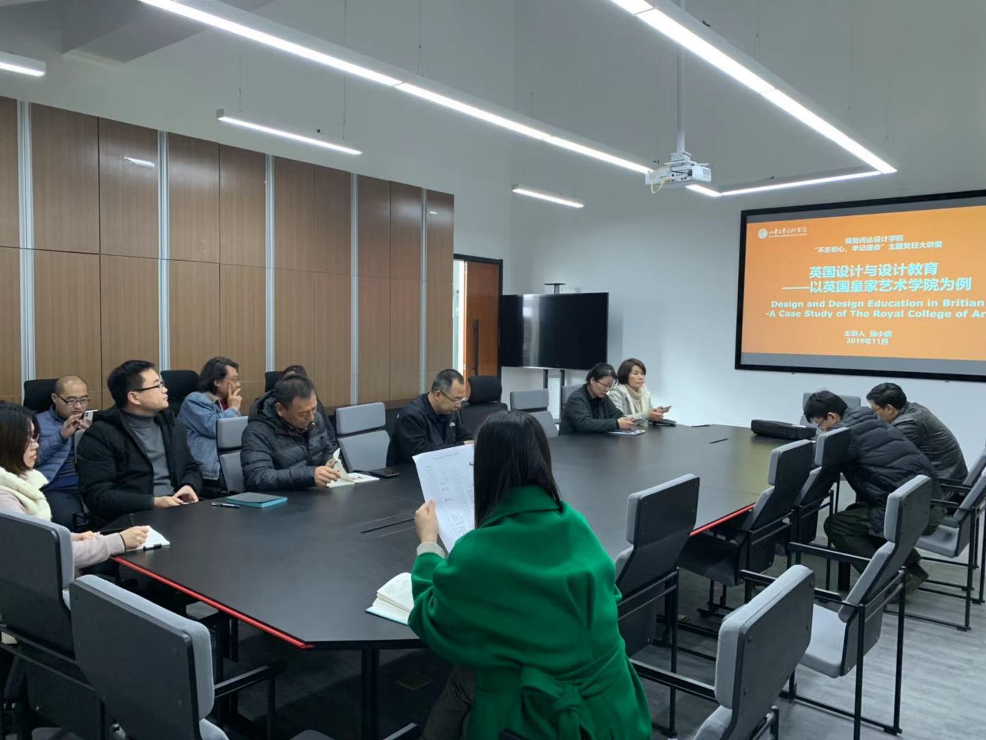 2019年12月10日,视觉传达设计学院党总支在学院三楼会议室召开题为《英国设计与设计教育—以英国皇家艺术学院为例》的主题党日大讲堂活动,担任本次主讲的是教工党员张小娟老师。学院全体教工党员和部分教职工参加活动。