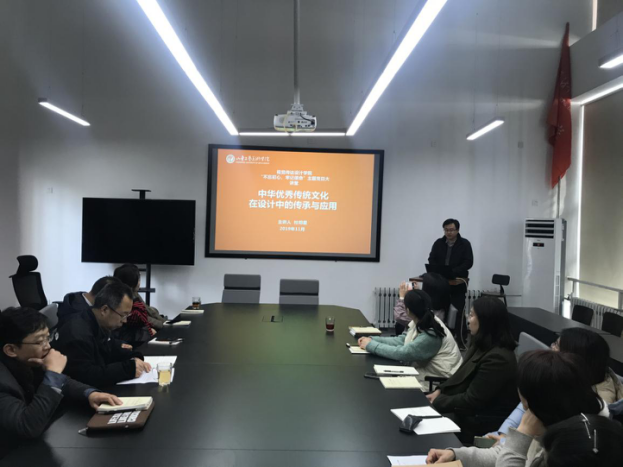 11月19日下午,视觉传达设计学院召开主题党日大讲堂活动,教工党员杜明星担任主讲,题目为《中国优秀传统文化在设计中的传承与应用》,视觉传达设计学院全体教工党员参加活动。