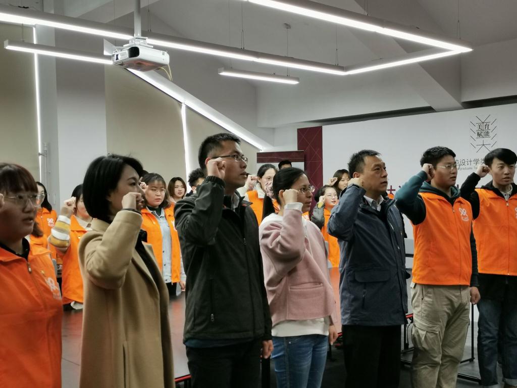 在校歌《设计师的摇篮》优美旋律中,学生第二党支部书记陈瑶庄重的为党员志愿服务队代表授旗。