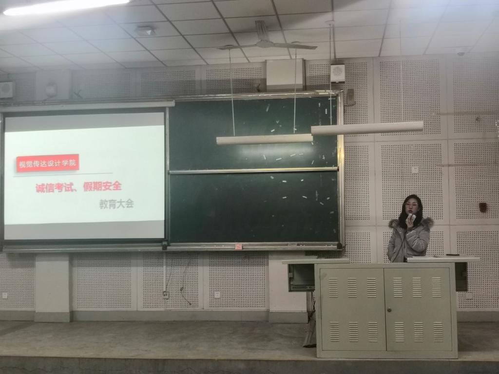 1月9号下午,视觉传达设计学院于综合办公楼四合堂分别召开2017、2018级假期安全暨诚信考试大会,会议分别由视觉传达设计学院辅导员刘阳老师、陈瑶主持,党总支副书记刘爱民出席会议。