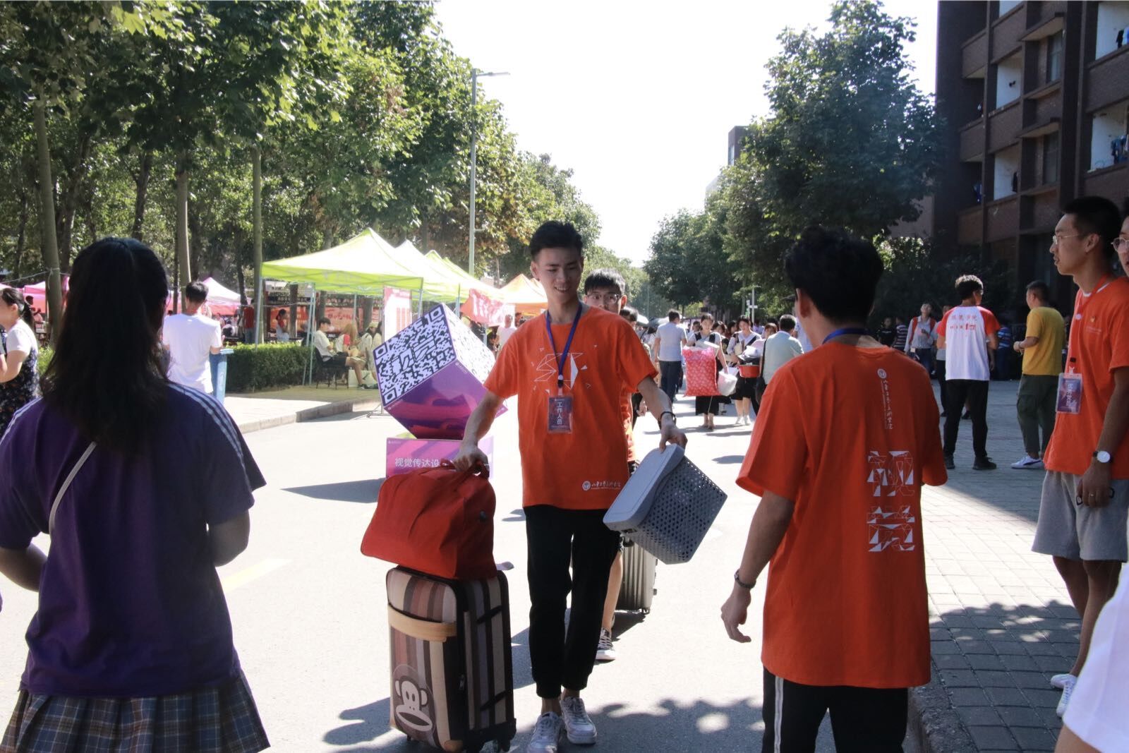 早6:30,视觉传达设计学院迎新志愿者们统一着装,准时集合,布置场地,整理材料,早早做好了准备工作,等候大一新生的到来。7点半左右,新生们陆续抵达校园,各项引导,报到工作都进行的井然有序。学校各校门处均安排了志愿者们手持引导牌,负责带领新生抵达报到地点;报道点也按照办理流程,安排了对应的志愿者帮助新生完成学费审核,档案提交,报道注册等工作,并有志愿者专门负责帮助新生指引宿舍,搬运行李。此外,视觉传达设计学院特别设立了家长休息区,为学生家长提供休息、饮水空间。此处也是学院“学生党员示范岗”,由在校生党员负责安排家长休息,为家长介绍学校、永利官网,解答家长提出的专业就业、师资、等等问题。此外,为迎接2018级新生,学院特别制作了宣传展板,帮助新生和家长了解学院和专业,并精心设计了车票样式的拍照墙和二维码立方体,以富有创意的形式和高超的专业技巧,为新生和家长营造热情、愉悦的氛围,凸显学院的人文关怀。大家纷纷在车票拍照墙前留念,这一创意也得到了前来视察迎新工作的学校领导的认可。