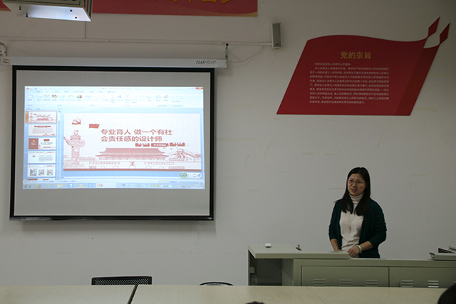 课上,刘老师结合十九大报告,从中国共产党人的初心和使命讲起,结合学院的实际,从专业培养目标、优秀传统文化、工作室导师制、专业实践、主题创作几个方面详细向大家描述了如何才能成为一名优秀的有社会责任感的设计师。紧接着,向大家展示了学院优秀党员模范的事例,希望入党积极分子要向学生党员模范靠拢学习,提高自己的责任、能力和素质,努力在各方面起到表率作用。最后,刘阳老师希望大家在思想上认真对待党课,端正入党动机和学习态度,全心全意为同学服务,要有积极向上的榜样精神,在生活和学习上起到先锋模范作用。