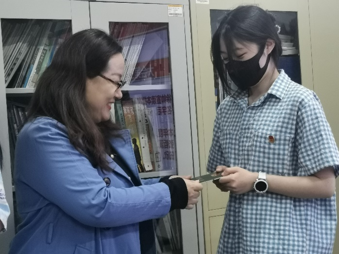 徐帅宣读了新团员的名单,张焱、韩丽达、徐帅、王艳、韩卫萍、王君秋为新团员颁发团员证并佩戴团徽。