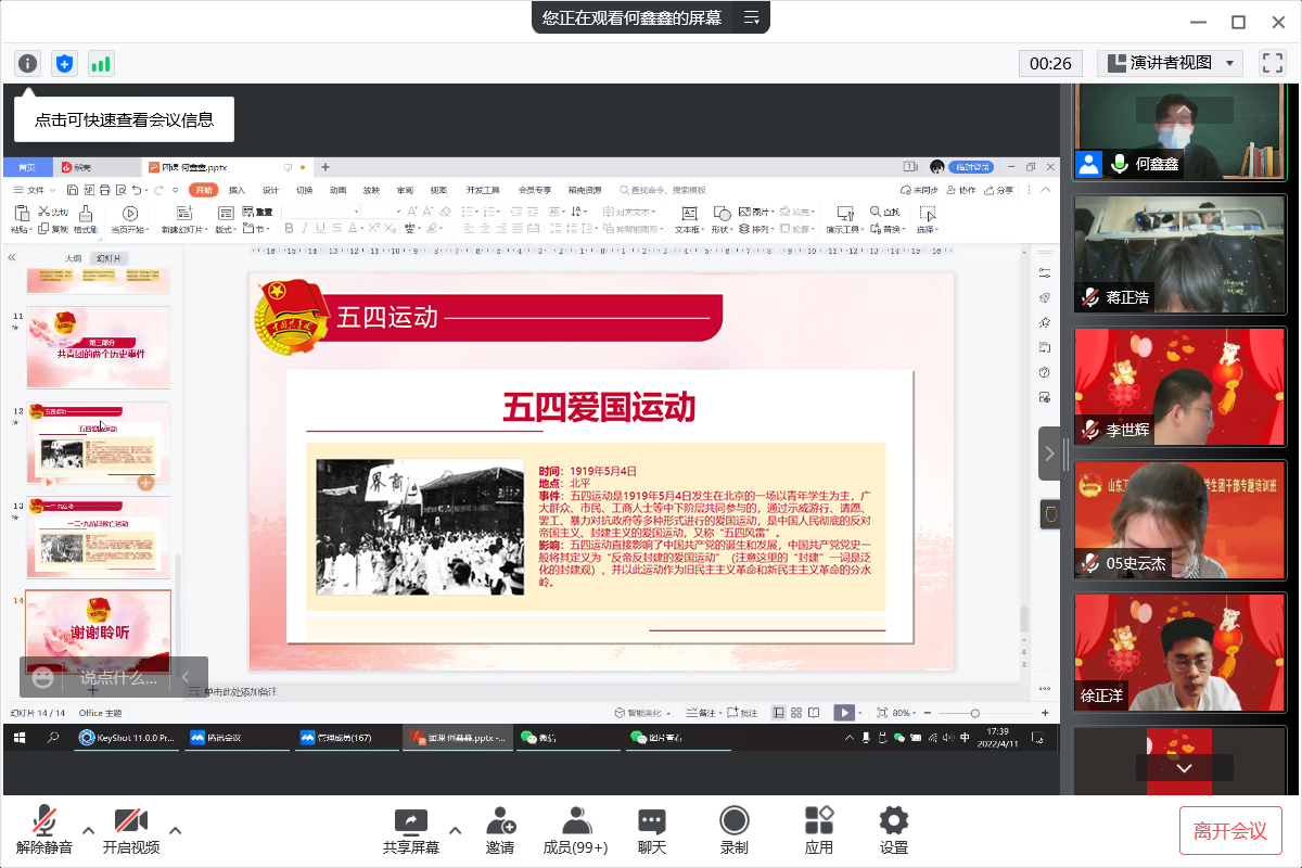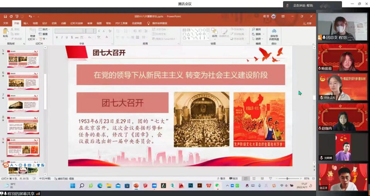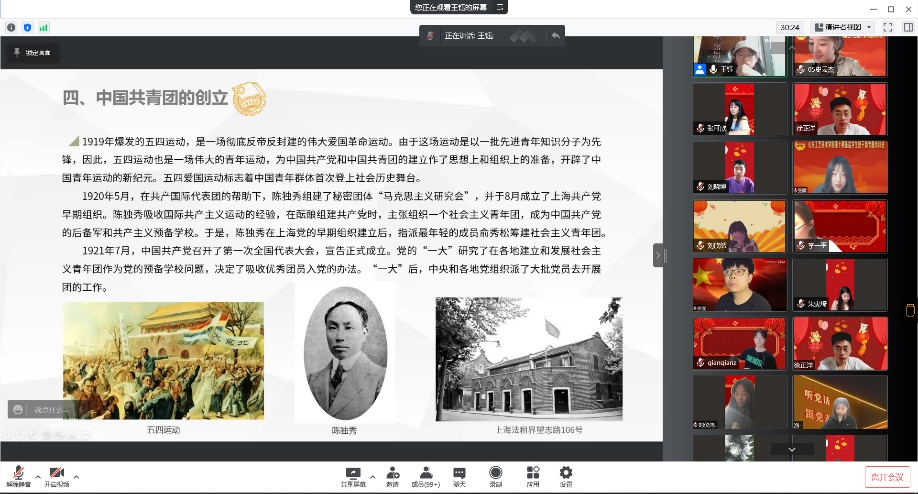 回望百年,青春向党。2022年是中国共产主义青年团建团一百周年,校团委号召,要教育引导同学们树立正确的理想信念和价值取向,高举团旗跟党走,进一步明确当代青年的责任与使命。4月11日,工业设计学院团总支组织青年团员开展“砥砺奋进守初心 青春献礼二十大”线上主题团课。
