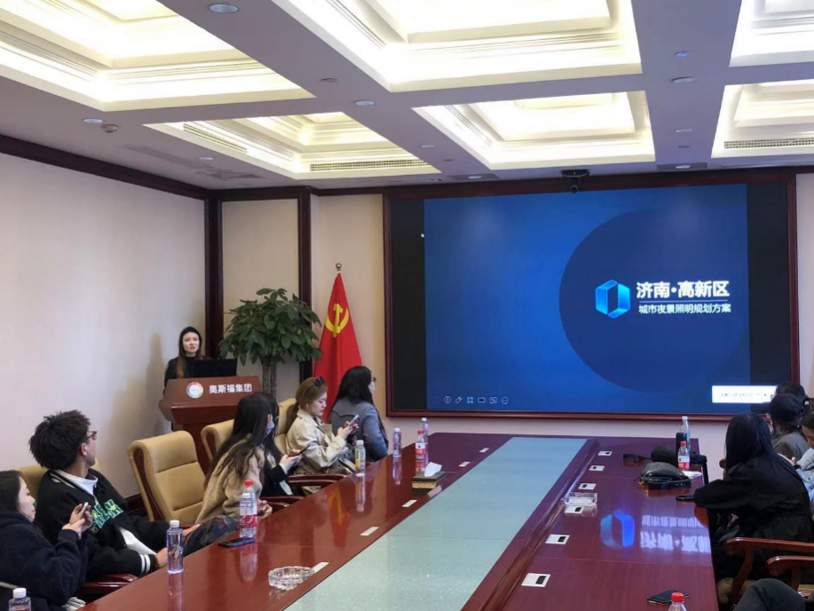 在奥斯福市政工程有限公司,学生们参观了企业最新竣工的多媒体展厅,并认真学习了以济南高新区城市夜景照明规划方案为例进行的讲座。
