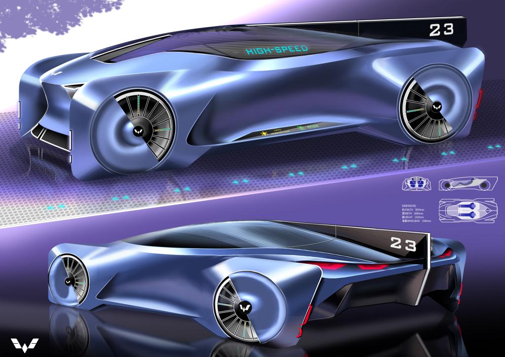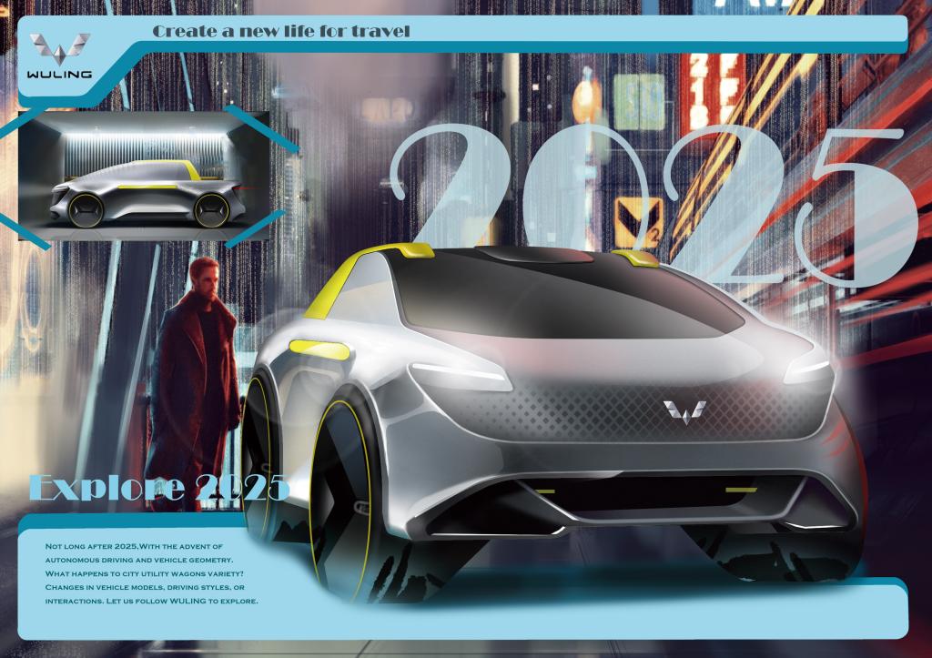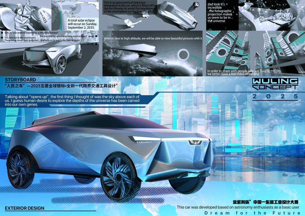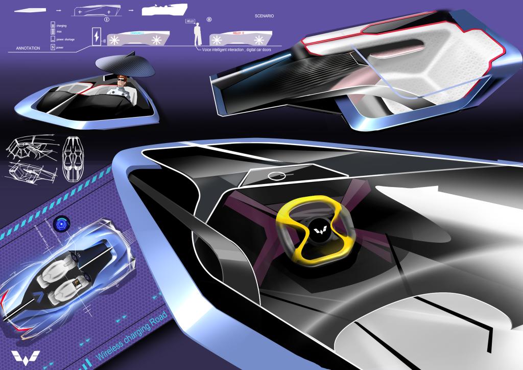 刘露航同学的设计作品五菱概念电动轿跑车,定义为面向大众的全新跨界交通工具,以电轿的续航问题为设计切入点,利用无线充电技术使车与道路融合,从而从根本上解决电动汽车续航问题。车辆外饰设计采用飞行器抽象仿生形态,体现跨界交通工具的科技感与未来感;内饰设计融合智能互联、自动驾驶概念,给用户提供多元化的驾乘体验。刘惠文同学的设计作品“星尘”跨界SUV,以新型户外娱乐为设计出发点,将汽车作为移动智能终端,车辆内饰设计有环抱式座椅、围绕车顶的升空式望远镜,方便多人一同观测星空,体检跨界车辆带来的独特乐趣。郭昂同学的设计作品多功能跨界皮卡车,以模块化产品设计方法为理念指导,皮卡车后半部分采用多功能模块化拼接设计,既可以满足用户个性化出行需求,也可以为当地旅游区提供折叠式模块化休息空间,体现五菱“人民之车”理念中乐于分享、热情好客的内涵。