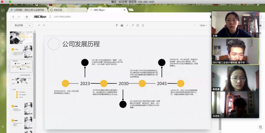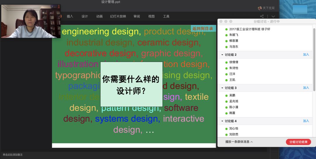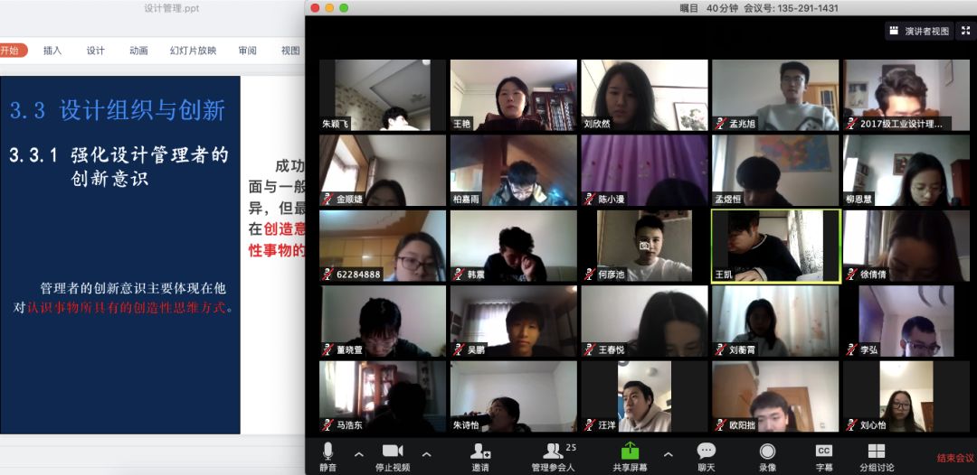 线上教学与线下教学最大的区别在于教学的现场感,担心教学过程会“隔靴搔痒”,因此,如何减少师生间的距离感是老师,也是学生关心的问题。为避免正式上课时出现网络大面积拥堵的情况,面对目前丰富的网络教学学习平台,《设计管理》教学团队的老师们选择了多元化的网络交流方式,采用瞩目app视频直播、PPT+音频直播等形式,充分利用瞩目app视频会议+屏幕分享、长江雨课堂语音直播+PPT共享的方式,保证教学过程的顺利进行和学生的课堂体验,并利用视频会议、微信群等直观有效地监督学生的出勤率,及时观察学生上课的状态,对于专注力不够的同学给予适时提醒,把控课堂的整体互动情况。