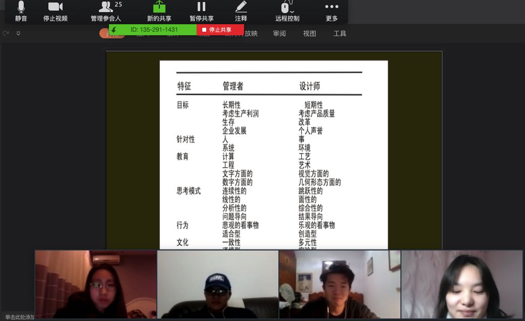 《设计管理》课程由课程负责人召集相关授课教师提前进行线上集体备课,并对同步上课的内容和形式、作业要求及评阅标准等进行了集中探讨,要求老师们明确线上教学目标和教学计划,对课程内容及整体节奏的把控做到心中有数。尤其针对理论课程如何在线上教学中能使学生觉得更有兴趣,做了教学方案的及时调整。