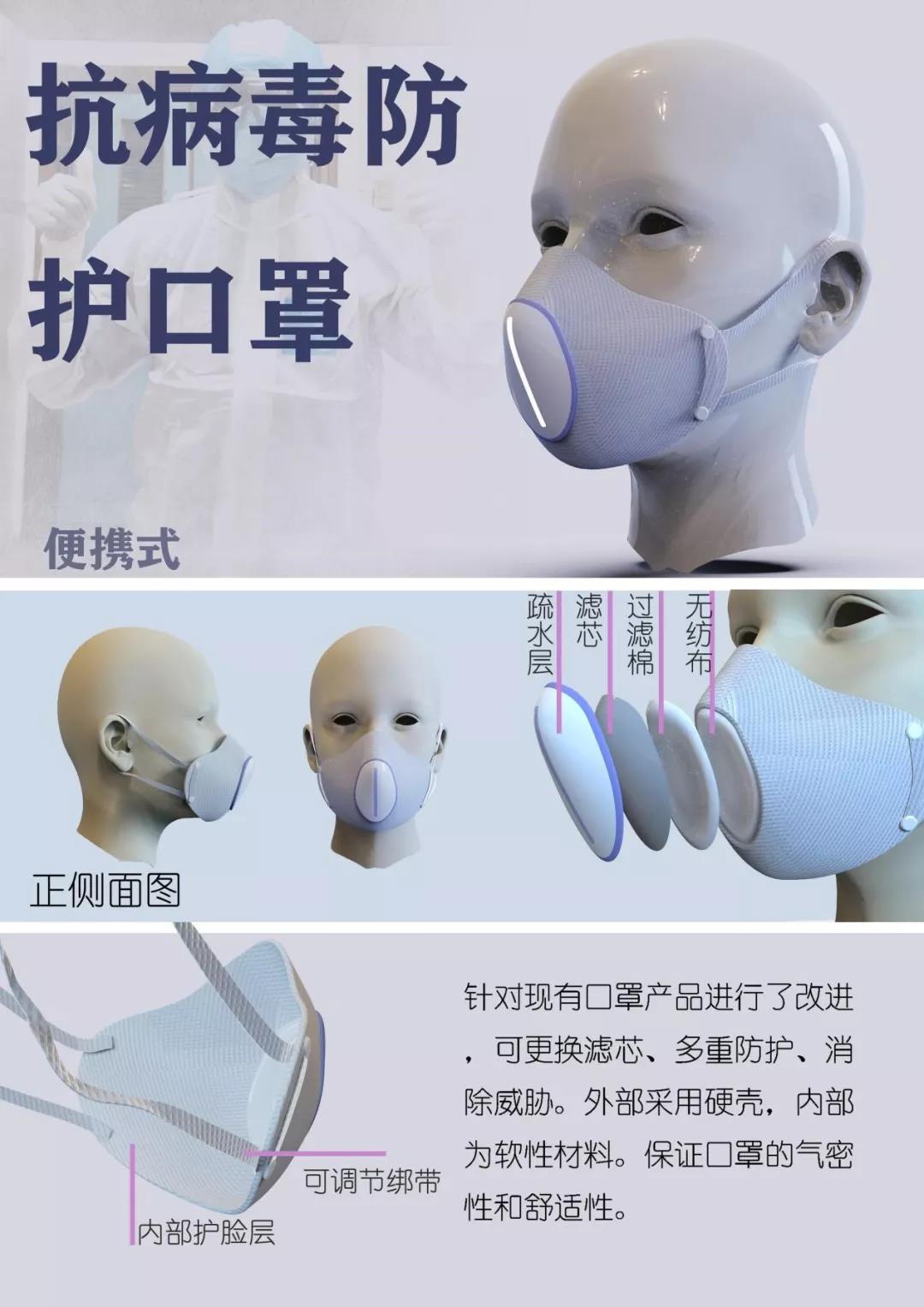 本产品设计为便携性防护口罩,主要是对现有口罩产品加以改进,既可更换滤芯,还可运用多重防护消除威胁。外部采用偏硬性仿皮革,内部为软性材料,保证口罩的气密性和舒适性,让使用者能更舒适地进行防护。