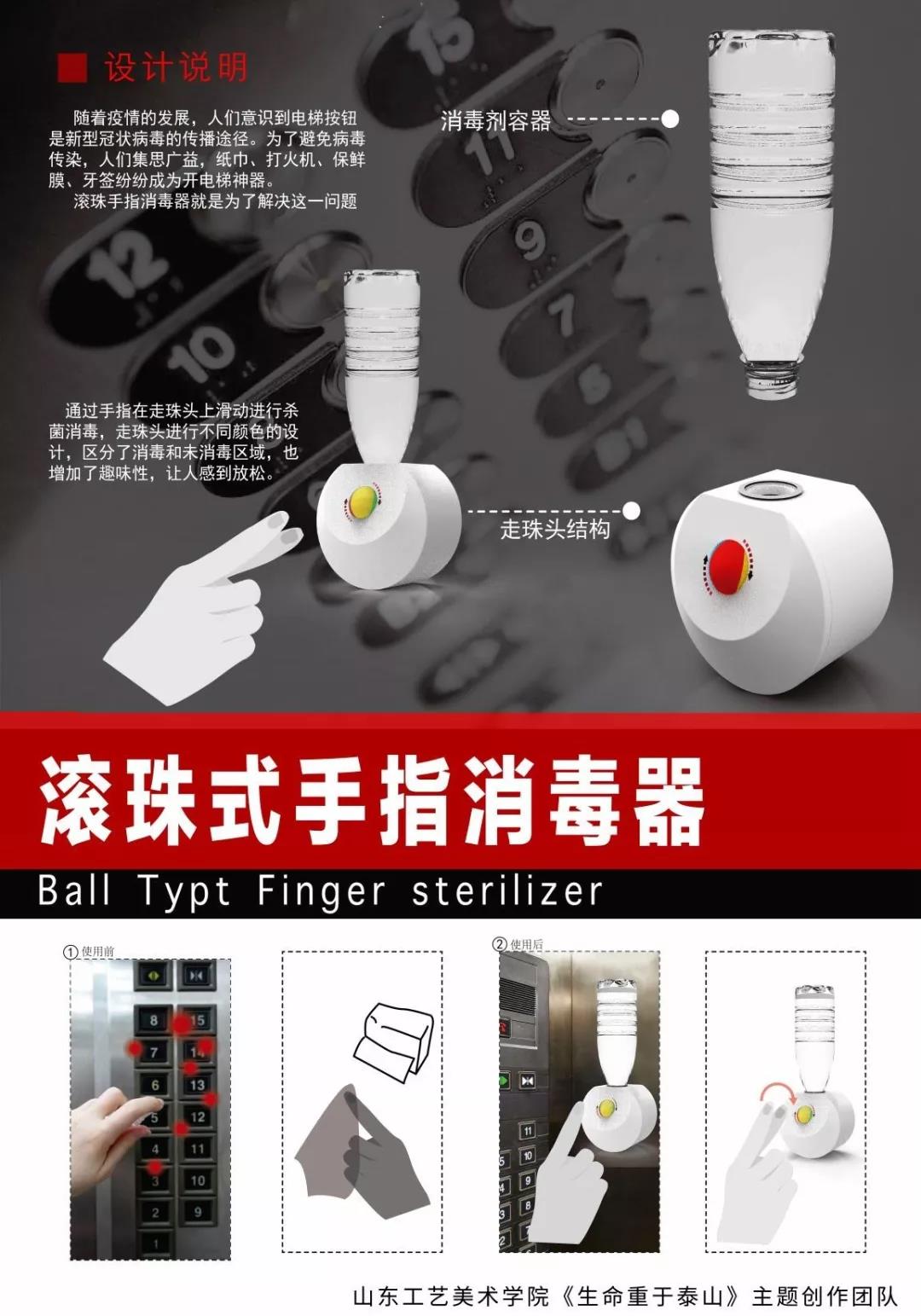 随着复工潮的到来,电梯空间已成为新型冠状病毒的重要传播区域。为了避免病毒传染,人们集思广益,纸巾、打火机、保鲜膜、牙签等纷纷成为开电梯神器。滚珠手指消毒器的设计就是为了解决这一问题。该设计最大的特点就是可通过手指在走珠头上滑动进行杀菌消毒。走珠头进行了不同颜色的设计,区分了消毒和未消毒区域,增加了趣味性。