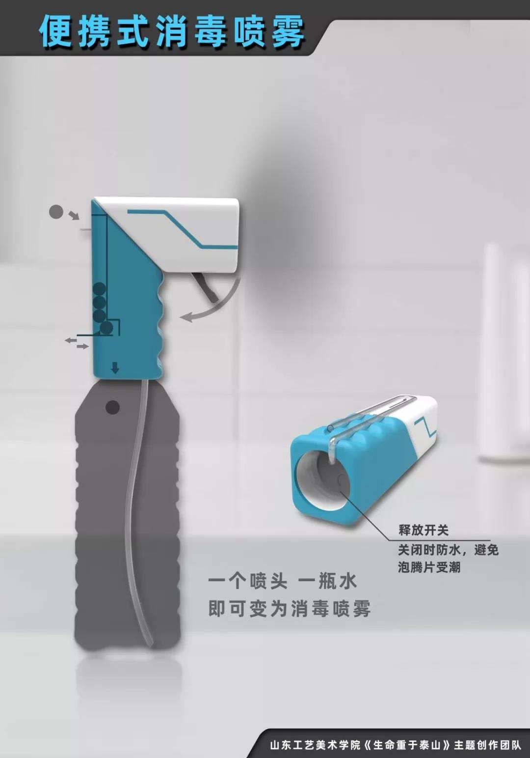 疫情防范期间,各类空间需要进行消毒处理,作为专业消毒器材的有效补充,需要一款便携式消毒喷雾器。该设计旨在利用身边矿泉水,通过便携消毒喷雾产品,经过简便的配置消毒液过程,调配出标准消毒药水。