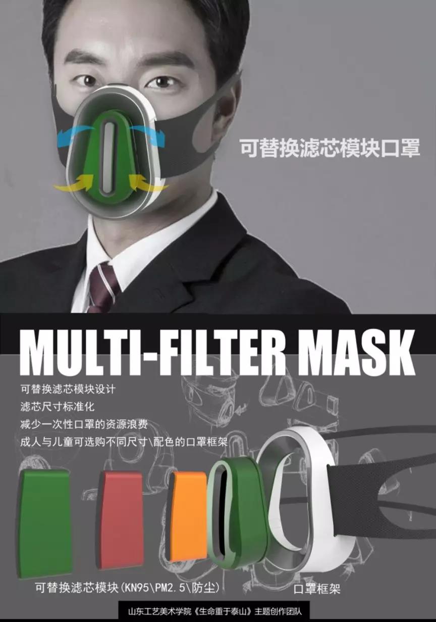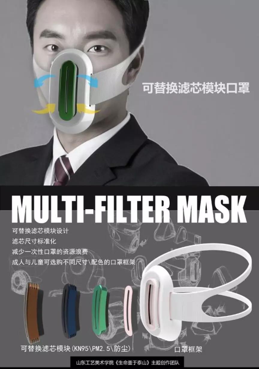 我们希望设计一款可替换滤芯模块的口罩,使其可以成为家庭日常必备防护产品之一。用户可根据需要进行中心滤芯模块的替换,不同功能滤芯模块采用不同色彩进行区分,如黄色防菌滤芯、蓝色PM2.5滤芯、绿色防尘滤芯等。中心滤芯还可根据使用情况,进行滤芯使用寿命的提示。成人与儿童可选购不同尺寸、不同配色的口罩框架,而可替换滤芯模块则采用尺寸标准化、结构统一化设计,从而减少对于大自然的资源浪费。
