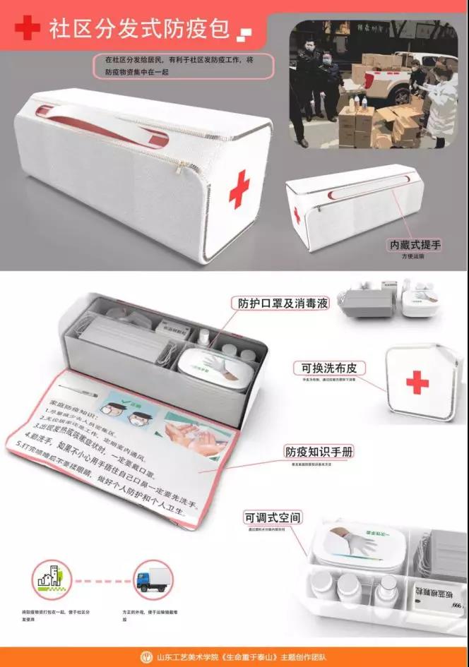 针对社区防疫设计了一款利于在社区分发的防疫包,整体分为两层,第一层是布制外包,上有利于提握的把手,拉开拉链即可打开内包,装有口罩,消毒液,手套,药品等防疫物资,并用塑料板分隔不同物资存放区域,空间大小可调,同时外皮使用医用防水材料包裹,拉开拉链即可将外皮清洗消毒,防疫包内表面还印有防疫知识,拆下后即可阅读,方便在社区普及防疫知识。