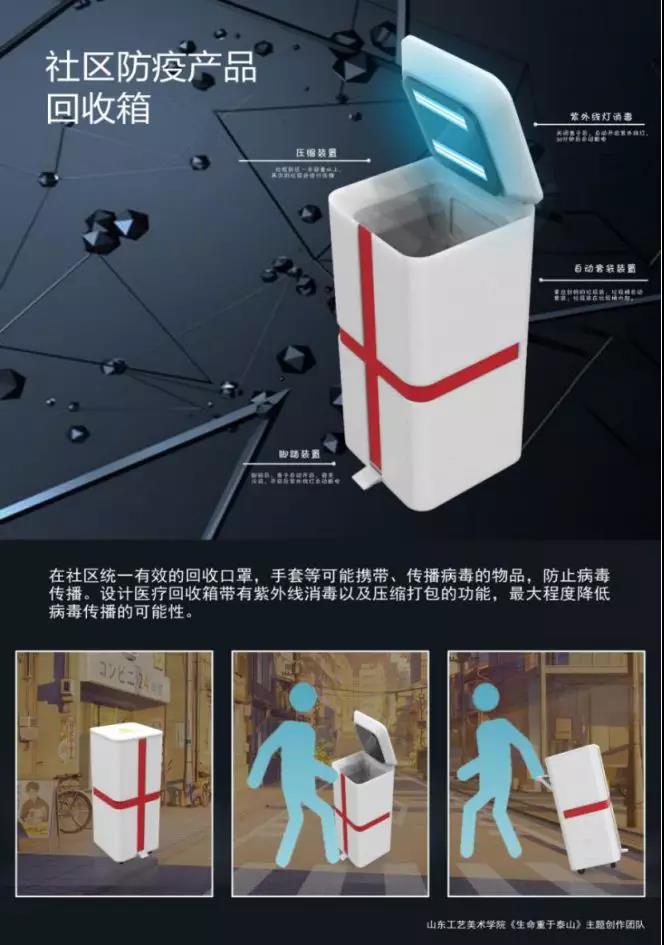 在本次疫情中,使用了大量的口罩、手套灯防疫防护产品,它们往往是集中携带、传播病毒的物品,与生活垃圾混装将带来危害巨大的二次交叉传染。针对这一问题,我们在社区统一设置“社区防疫产品回收箱”,集中回收口罩、手套,防止病毒传播。防疫产品回收箱带有紫外线消毒功能,投入垃圾关闭盖子后自动开启紫外线灯,照射30分钟或者打开垃圾盖自动断电。还有压缩打包的功能,垃圾容量过半会触发压缩功能,垃圾满箱会自动打包等待回收,取出打包垃圾后自动套袋。此回收箱需使用充电电池。