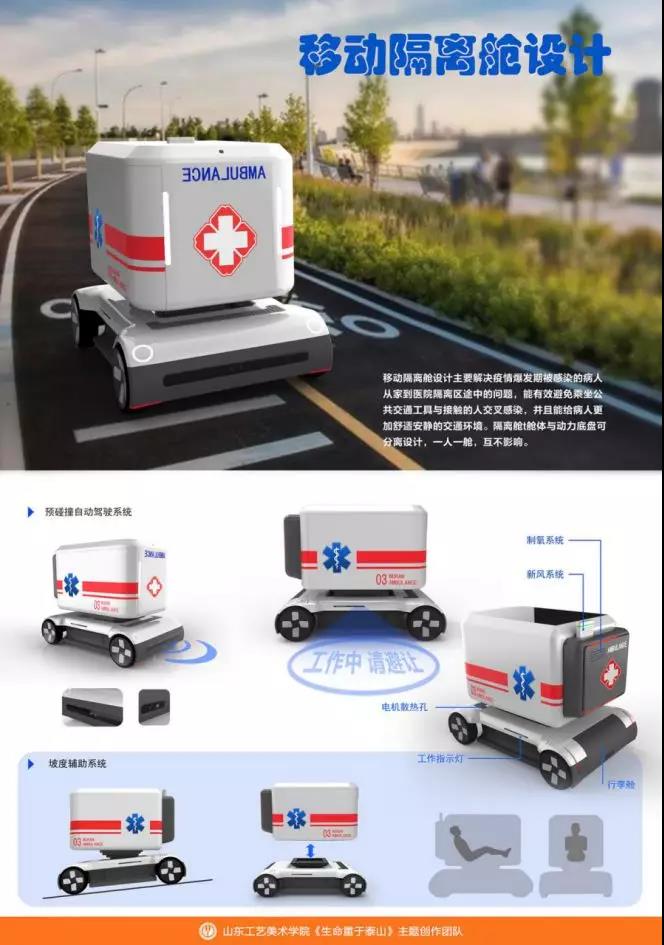 移动隔离舱设计主要解决疫情暴发期,被感染的病人从家到医院隔离区途中的问题,避免乘坐公共交通工具产生交叉感染的情况,并且能给病人更加舒适安静的交通环境。隔离舱舱体与动力底盘可分离设计,一人一舱,互不影响。