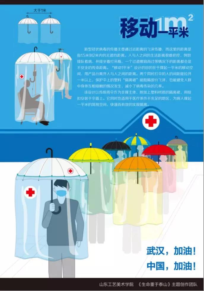 新型冠状病毒的传播主要通过近距离的飞沫传播,而这里的距离是指1.5米到2米内的无遮挡距离。人与人之间的生活距离很难把控,例如排队看病、并排坐着打吊瓶、一个过道擦肩而过等情况下的距离都会是不安全的传染距离。“移动一平米”设计的目的在于撑起一平米的移动空间,用产品分离开人与人之间的距离。两个同时打伞的人的间距能拉开一米以上,保护伞上的塑料“隔离裙”能阻隔部分飞沫,也能避免人群中身体互相接触的情况发生,减小了病毒传染的几率。