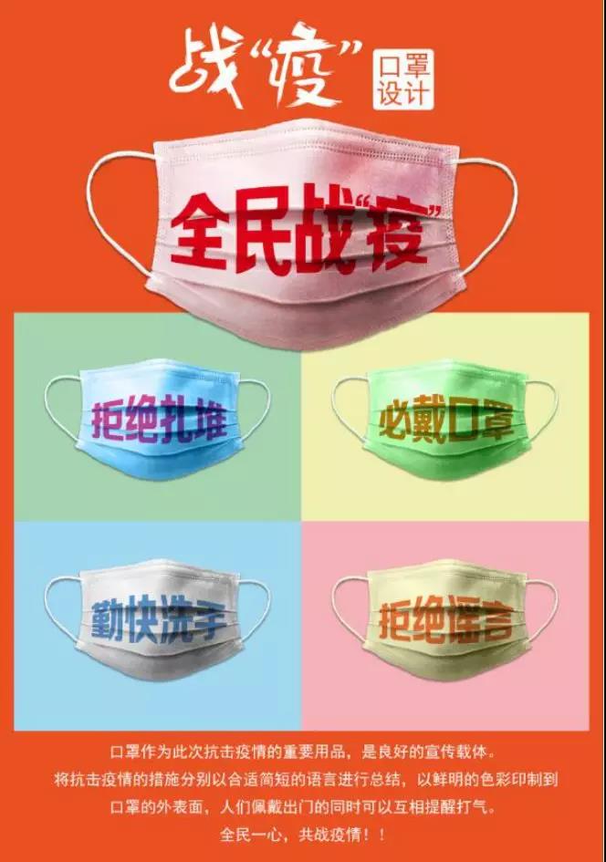 口罩作为此次抗击疫情的重要用品,是良好的宣传载体。将抗击疫情的措施分别以合适简短的语言进行总结,以鲜明的色彩印制到口罩的外表面,人们佩戴出门的同时可以互相提醒打气。全民一心,共战疫情!