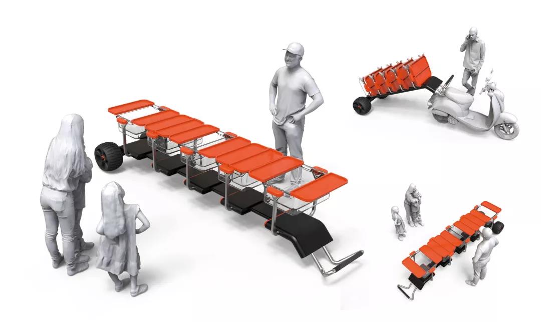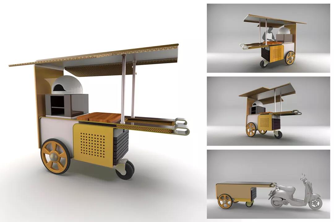 以流动商贩的摊位为基础进行再设计,以设计服务民生为设计理念,通过改变摊位的结构来方便流动商贩的出摊收摊过程,设计了一款轻型化、便捷化、多功能集一体的餐车,即解决了流动商贩的需求,也适应了快节奏、便捷化的居民生活需要。