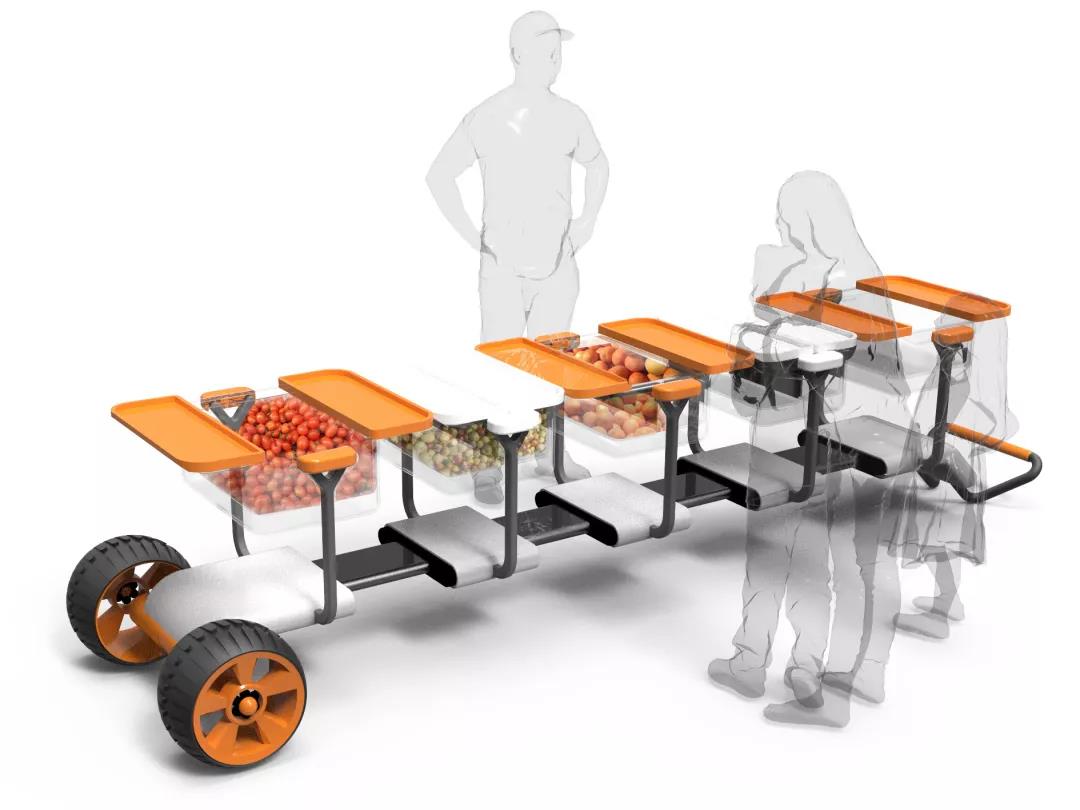 该产品从“设计改变民生”角度出发,为水果流动商贩设计的一款流动摊位推车。这款推车共五个箱体,选用透明材质,让人一目了然。收起来时占地面积小,把手可衔接于电动车或三轮车上,扩大了流动范围,为流动商贩提供了方便。双层箱体冬季保温,夏季可放置冰块,在炎热的夏季提供一份清凉。