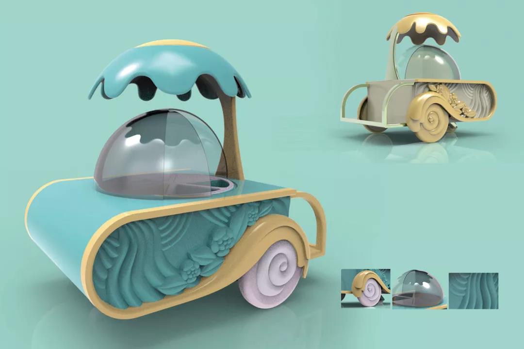 为流动商贩的移动设备进行再设计,解决脏乱差现象,赋予流动商贩美的情感。车身被蠢蠢欲动的奶油包围,造型萌动可爱;另外使用功能上插入了拉伸旋转的设计,提高用户的使用情感;最后配色上选用冰淇淋的清新搭配,告别传统餐车的乏味,提升视觉上的体验。通过这次毕业设计的开展,我学习到了很多东西,也感谢一路相伴的“战友”和耐心指导的老师们!