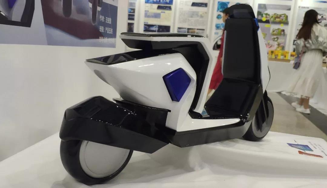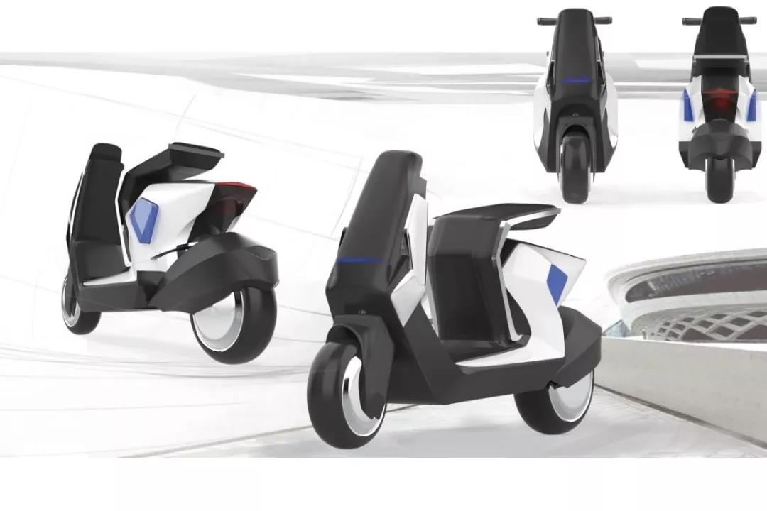 电动摩托车整体比例形态感性,穿插的结构设计使得电动摩托车整体协调,且轮距比普通电动摩托车更长,增强了整体动势。风格设计方面借鉴了几何化的建筑设计,将棱角和曲面相互融合;折面穿插的关系中加入榫卯结构元素,加强车辆紧凑感使得车辆细节丰富避免车辆过于厚重而影响车辆的协调性。工程结构上采用后置减震,镂空减震式的坐垫与后挡板相呼应。坐垫分层的设计与车体相穿插,让车体更加稳定。前大灯采用智能光感设计,在不同环境下可对不同强弱的光线进行调整。LED灯带对称排列,集位置灯、刹车灯、转向灯于一体,通过人机之间的交互可以让前灯展现出不同效果的体验。远视灯分布在两边,中间留出大的面板,可表现出多种表情图案。车把参考变形金刚的设计元素,不用时可以折叠进两侧,远程遥控开启时模拟两翼弹出,使驾驶充满仪式感,同时让车辆表现出独有的专属性。