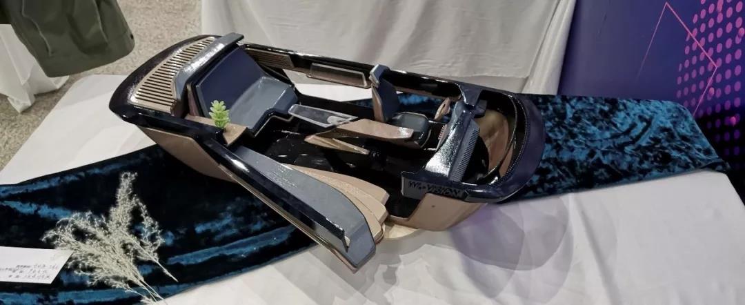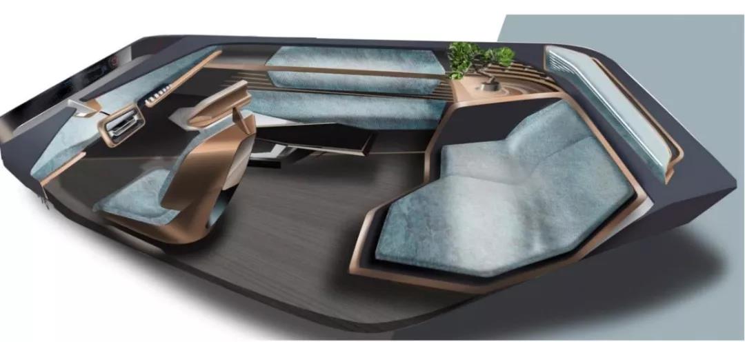 别克跨界轿车从顶部上看内饰空间的两半式划分与外饰车顶的车棚的两半式一半式透明相结合。座椅材质采用亲肤的毛毡材质,颜色采用渐变的水墨感,有青烟的意境,座椅后部采用金属质感,结合木质地板。造型上整体后排座椅造型易于收放,左边座椅串联收在一个插花板上,同时线条串联到侧面的靠枕,右边收在座椅扶手处,中控划分两部分区域一半驾驶操作,一半旋转成后小桌板喝茶。空间延展上,夹层的地板像扇子一样划出,同时座椅跟随地板划出,开放式空间可以和半开放建筑结合。开车野炊开车去喝咖啡,几个车友团队一同开车出游,利用相似的空间延展达到更好的交流。