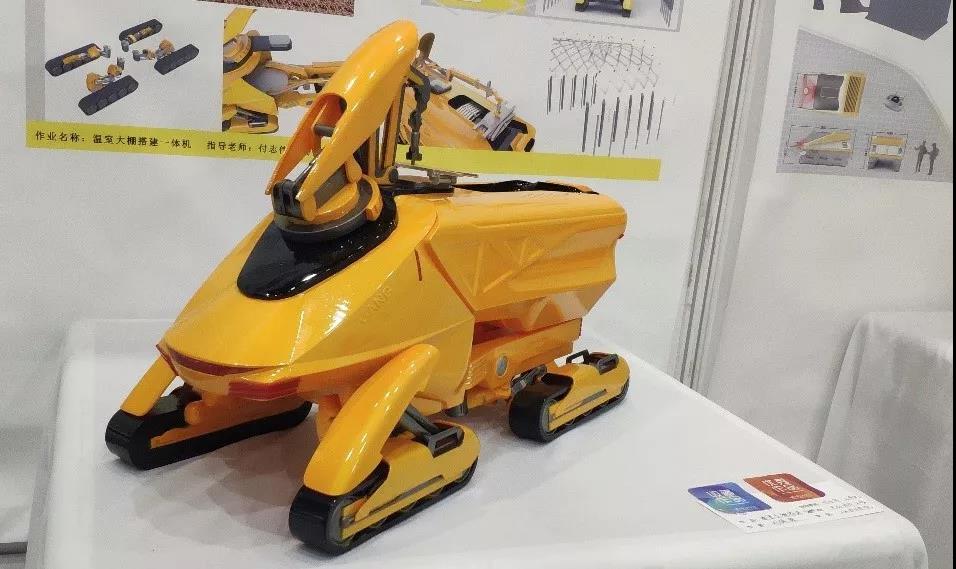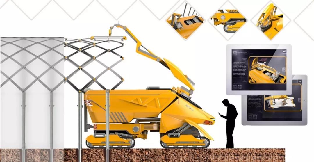 跨界运用四边铰链结构设计大棚支架,减少棚架零部件的数量,多种功能模块相互配合整合形成了一体式的搭建工程车辆。运用仿生设计对独角仙进行身体结构和形态分析,将履带轮与车身的连接部分做成机械臂,使其活动灵活、角度多变化适用于多种路面。抽象独角仙的身体结构进行功能模块化设计,功能区分成施工区、动力区、储藏区三部分。施工区利用网格线对地面进行扫描确定最佳打桩点,然后利用灵活的机械臂确定滑动角度,动力区输送动力,储存区用于储存施工工具其中包括大棚骨架、桩柱。利用人机交互设计让用户通过人机交互界面与车内控制系统联动,将工作人员、APP、工程车辆主体利用移动终端连接,行成统一的工作体系。