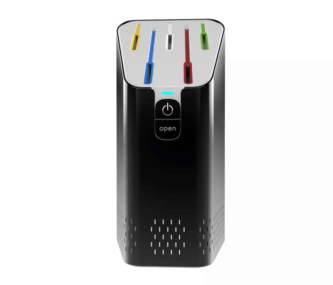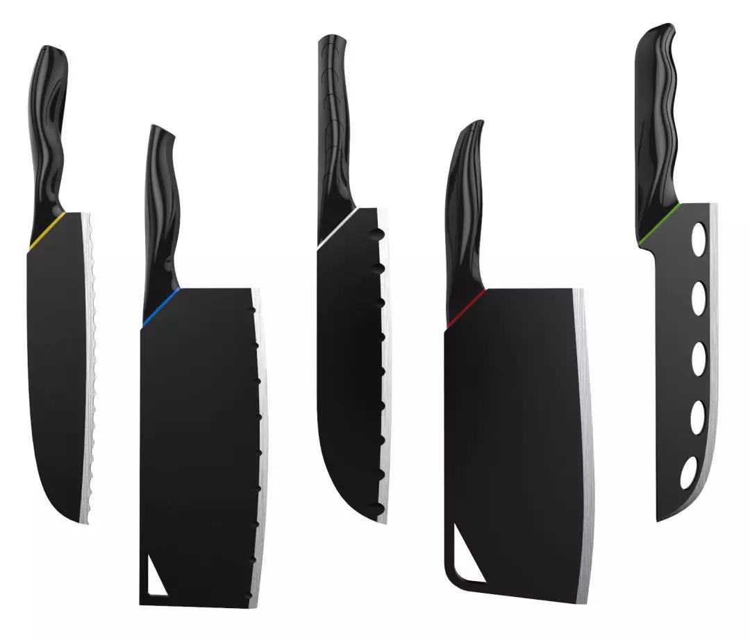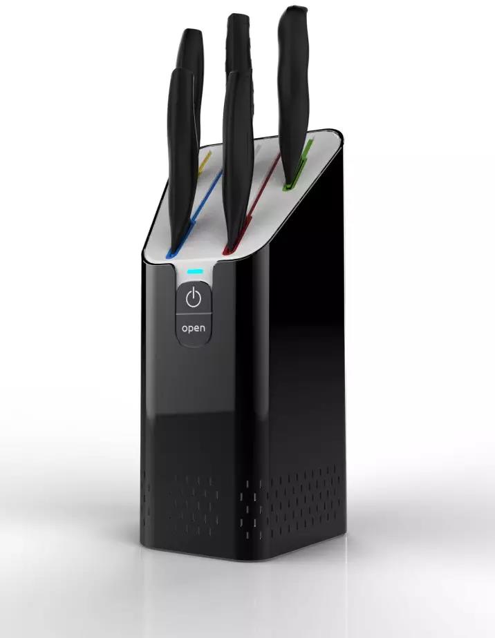 有效杀菌清洁的厨刀组合。可以减少厨刀上的微生物滋生,矫正小型厨房中使用厨刀的不规范。针对家庭厨房配备五种厨刀,厨刀一体化设计,减少微生物残留空间。配备臭氧杀菌系统消灭微生物。刀架内部设有臭氧发生器,向插槽内部充盈臭氧进行杀菌。杀菌结束后向空气中排放含低浓度臭氧气体,净化厨房空气。
