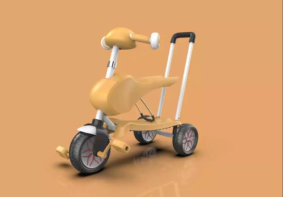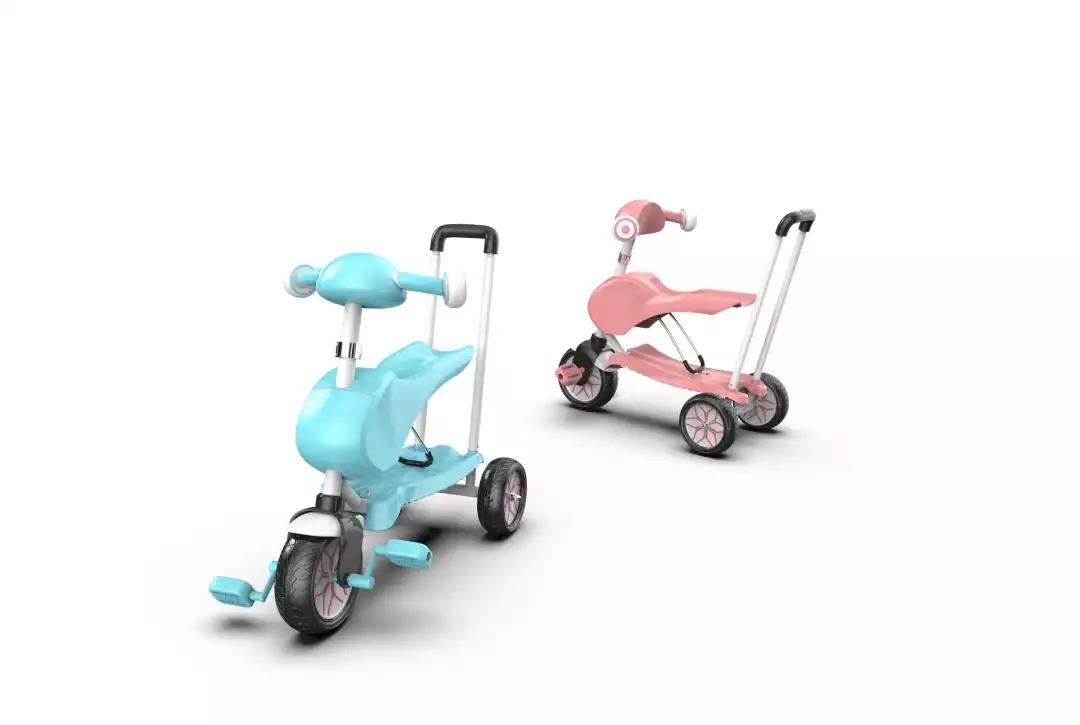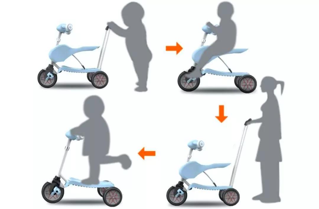 该设计以轻车快马为主题,核心功能主要以骑行车和滑板车功能为主,成人手推车、学步小推车功能为辅,四种模式可以任意切换。此款童车主要是针对5岁以下儿童使用,只需通过简单的拆装重组,可以使一辆玩具车拥有四种不同的玩法,实现一车多用。