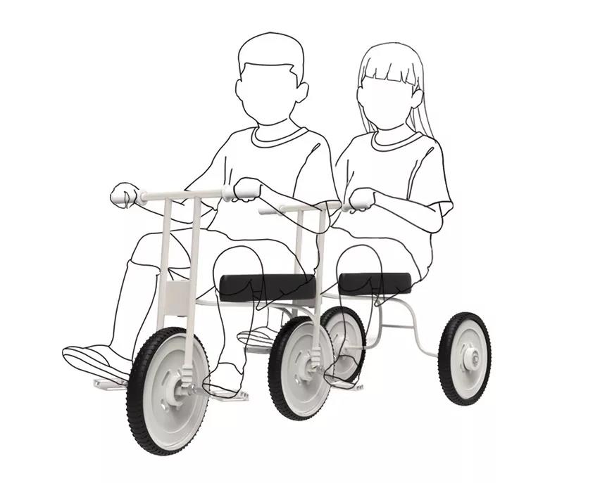 随着城市经济的快速发展,越来越多的人离开自己的家乡去大城市寻找工作机会。这就造成了现如今尤其是许多经济条件并不尽人意的偏远地区会出现越来越多的留守儿童。这些孩子由于从小缺少父母的陪伴,在成长道路上心理大多会非常的孤独和自闭。为了能让这些孩子心理更加健康,童年充满乐趣,也为了弥补这片被忽略的市场,设计一款适用于这些儿童的娱乐产品。乡村幼儿园双人脚踏车就此诞生。