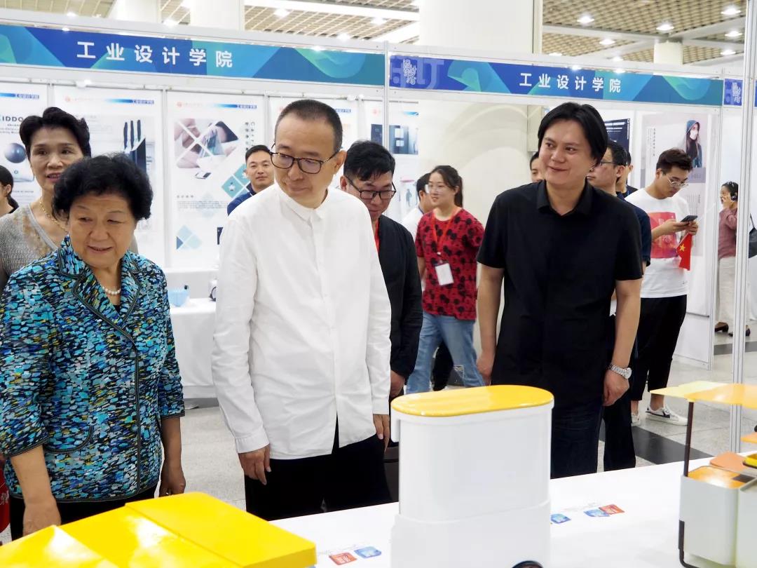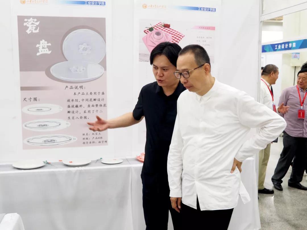 潘院长一行对工业设计学院精品展区、产品设计展区、公共设施展区、工业陶瓷展区、交通工具展区、艺术与科技展区及照明设计展区进行了参观指导。