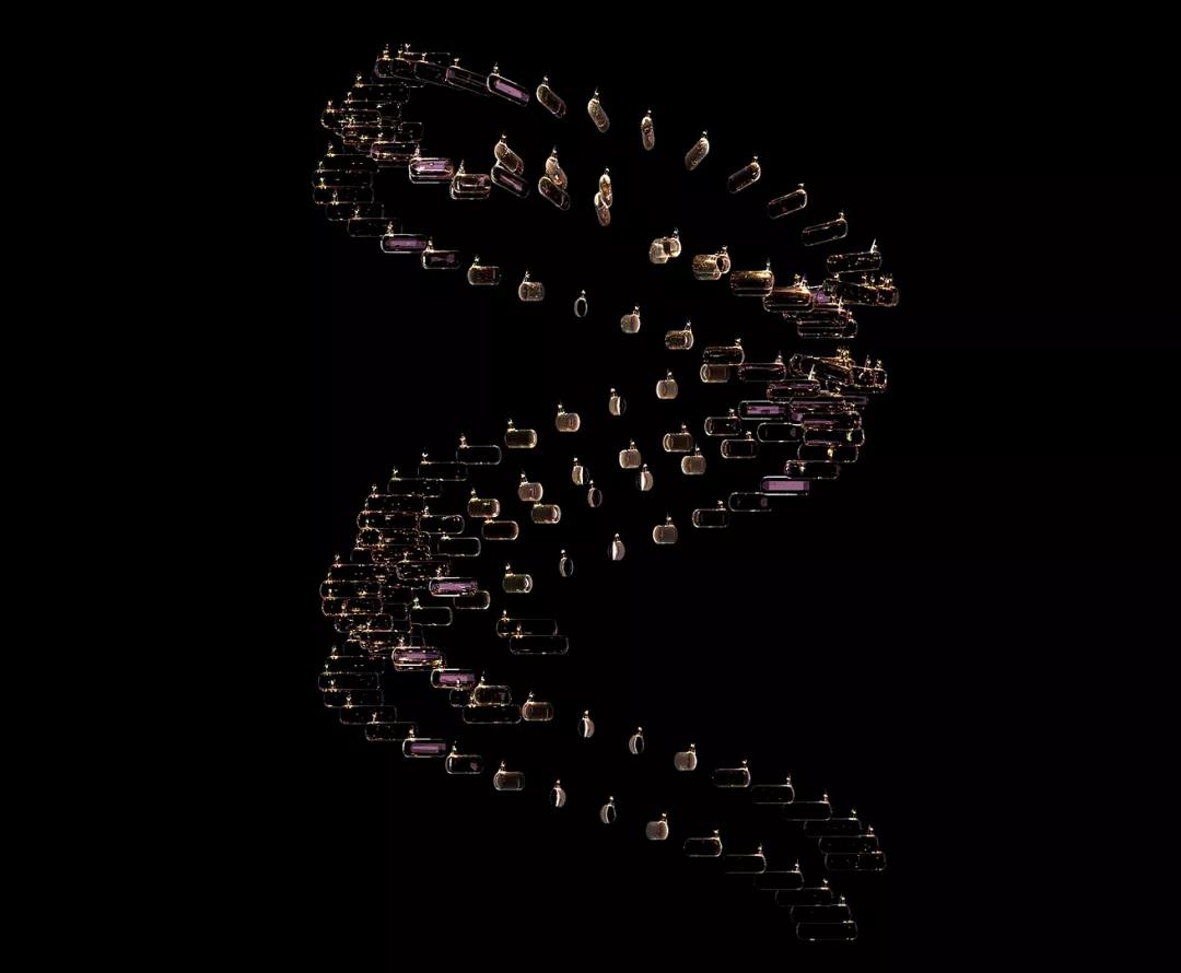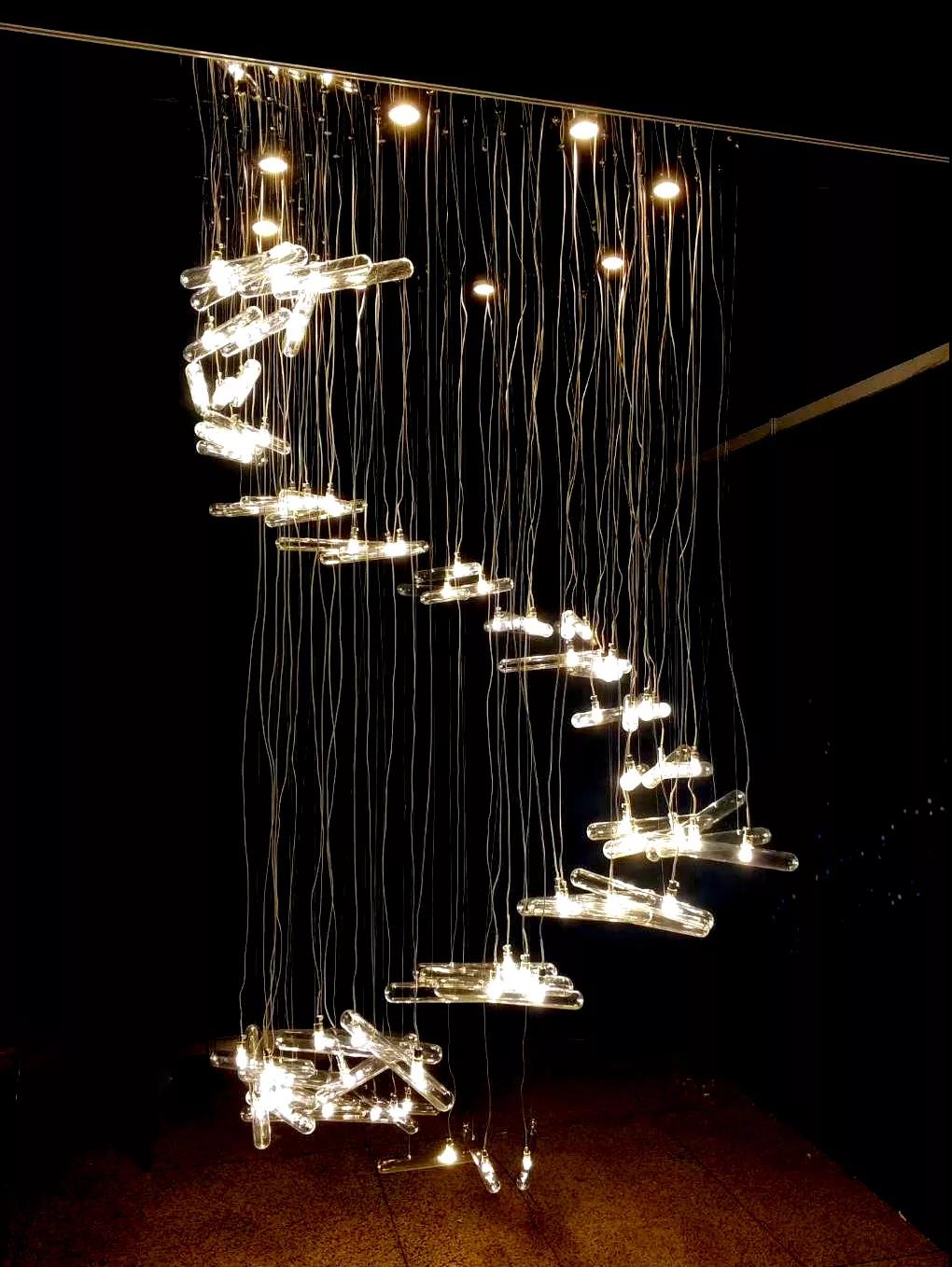 利用透明鱼线将玻璃试管与互动灯光相结合,以简洁明快的设计风格为主调。总布局采用“螺旋式”悬挂,利用鱼线的透明性和玻璃的质感,加上灯光的互动,增加观看者互动性。造型上追求化繁为简的设计,利用细节调节观赏性。
