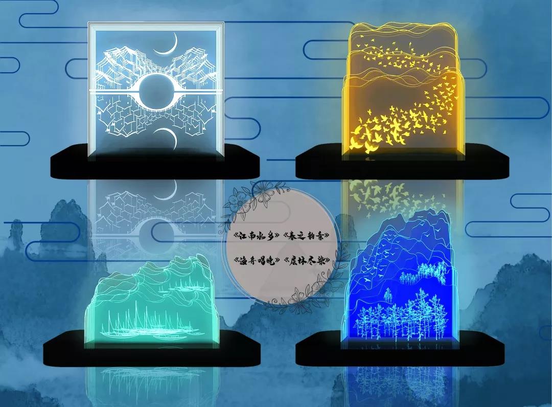 分别运用山、水、人家、渔船等元素为主体形象,采用传统绘画白描的手法结合最新的照明材料和手法,将山水的自然形态以及山水画元素与灯光变化相结合,突破传统文化的展现形式,既诠释了寄情山水景色的情怀,又给人不同以往的视觉效果。