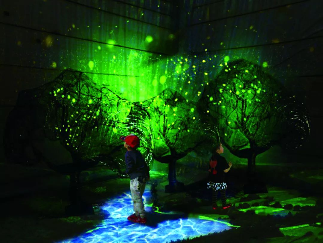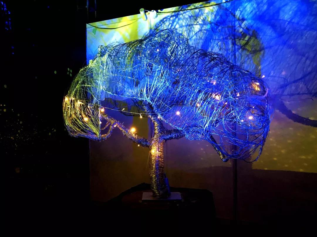 通过灯光装置展现人与大自然环境的交流,以自然元素的造型和奇幻的灯光效果组合,引导人们增加对环境保护重要性的认识。灯光形式主要是营造一种在静谧的田间、无忧无虑的捕捉萤火虫的感觉。地面是运用灯光投影器模拟出河流流动的感觉,装置背景投射萤火虫灯,缠绕出来的树造型上,交错缠绕上LED串灯,模拟萤火虫一闪一闪的光亮,萤火虫背景灯辅助营造出远处的萤火虫闪烁的效果。