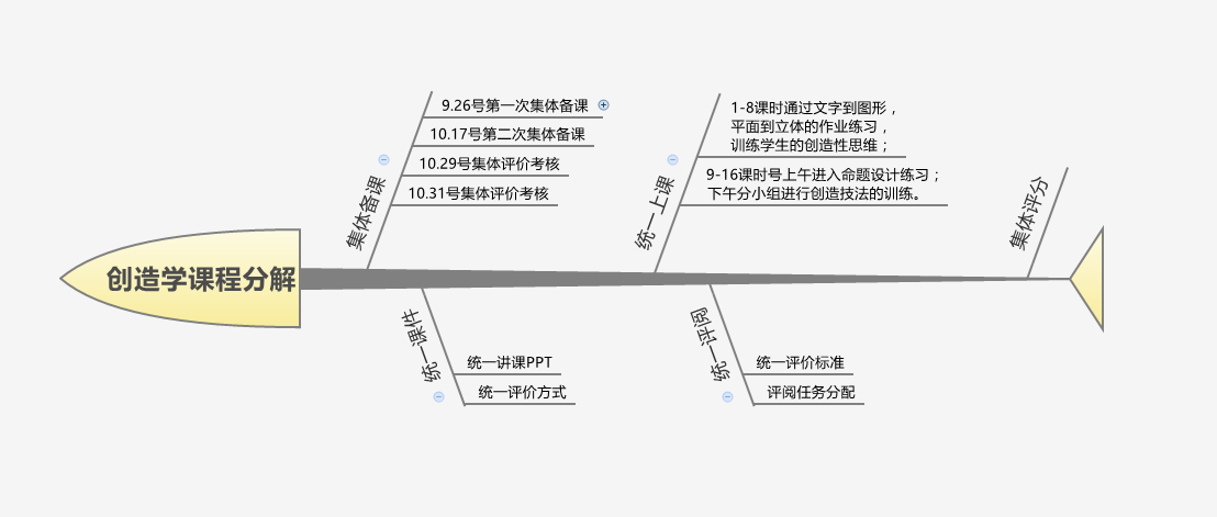 创造学》课程是我院学分制改革课程之一,授课对象由大三学生变为大一学生,原来的两周课程变为一周内完成,时间更加紧凑。改变最大的是由原来的老师个人备课-授课-结课变为所有讲授这门课程的老师集体备课、统一课件、集体评阅成绩。负责本课程的老师在课程开始前成立专门的课程QQ群,方便授课老师们的分享、交流和沟通,发现问题,及时调整。
