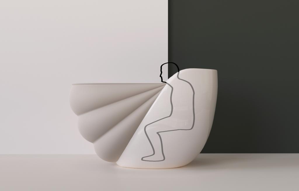 外观上,采用“海螺”的设计造型,亲切、富有温度感,符合老人洗浴时需要安全感的需求;功能上,浴缸前端结合现有的充气式气囊技术,有效解决老人进出浴缸不便的问题,在进出方式上有较大创新。