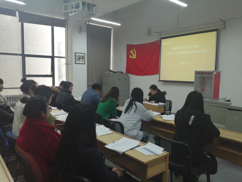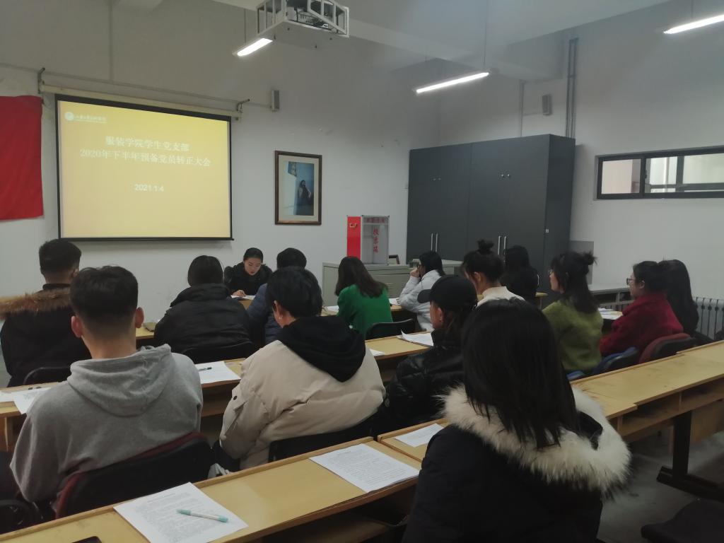 2021年1月4日,服装学院学生党支部在综合楼三楼多媒体教室召开中共预备党员转正大会,研究李俊洁、张露、翟玉磊、李萌、孙嘉淳、杨乐、王卓琳7位同志预备党员转正事宜。本次会议由学生党支部书记王苏主持,党总支副书记王金安及支部党员参加会议。