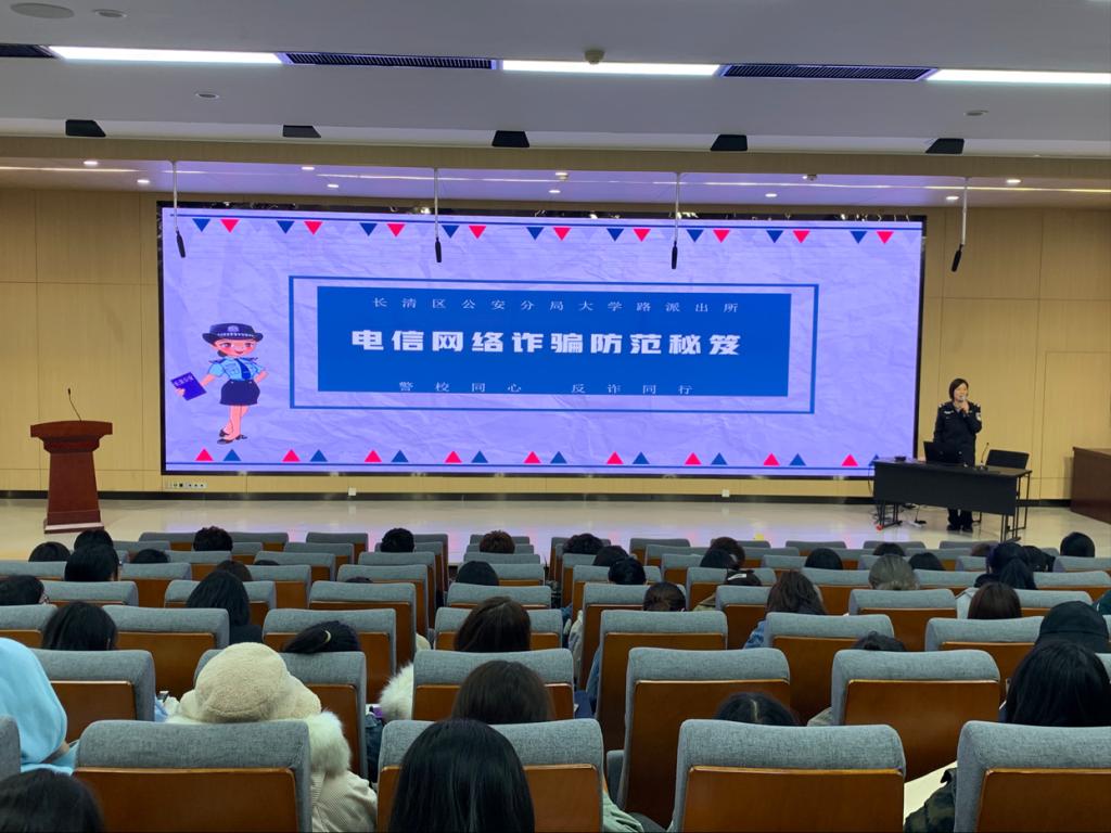 为增强新生对电信网络诈骗的认识,提升新生的识骗、防骗能力,维护校园安全稳定,11月4日下午,服装学院邀请长清区大学路派出所民警张立霞在长清校区阶梯教室开展防骗安全讲座。讲座以“警校同心,反诈同行”为主题,服装学院辅导员王苏及20级全体新生参加了讲座。