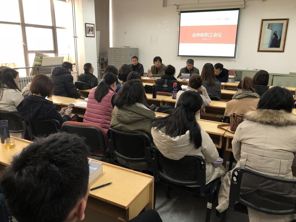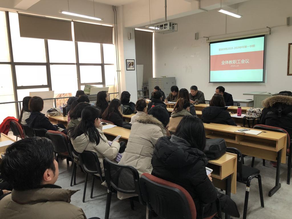 1月14日上午,服装学院在长清校区召开全体教职工会议。服装学院院长雷家民、党总支书记张利、副院长李杰、党总支书记副书记王金安及全体老师参加会议。会议由张利主持。 张利传达了全国教育大会和全省教育大会的精神,并就党委理论学习中心组(扩大)会议精神进行了重点传达,他要求大家认真学习领会习近平总书记重要讲话的精神要义,德高为师、身正为范,要时刻注意自己的言行,加强政治理论学习,提高思想政治觉悟,把学习贯彻大会精神和服装学院实际结合起来,真正做到学懂、弄通、悟透、做实。抓好师德师风建设,按照《新时代高校教师职业行为十项准则》的要求,加强师德师风建设,营造良好教书育人环境。 雷家民就2018-2019学年第一学期的教学、管理等方面的工作进行了回顾和总结,并对下学期的工作做了展望。他对全体教师提出了以下要求: 一、教师要注重知识能力,核心知识,综合素质的提高,进一步规划教学目标,提高责任意识,改进教学方法,不断提高教学质量。二、学校“招生考试工作周”期间,所有老师都要保持通讯畅通,根据学校的具体要求严格按时到岗,到位,随叫随到。提前合理安排好时间,务必保证能按时参加学校监考工作。三、各位老师要树立正确观念,遵守学校纪律,严格执行考勤制度。四、以课程作品展促进教学。鼓励支持教师在课程结束后,举办课程作业展,通过作业作品展提高教学质量,为不同专业及校内外师生之间的艺术交流搭建良好平台。五、今年学校将承办第十三届全国美术作品展艺术设计展区,这是全校的大事,服装学院要高度重视,明确重点工作,确保各项工作圆满完成。六、要时刻将校园安全系在心头,高度重视学院的安全工作。 最后,李杰对学分制改革、加强科研水平、第十三届全国美术展览、加强产教融合等方面进行了补充说明与强调。