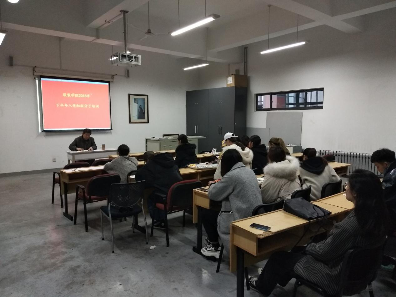 为了加强入党积极分子队伍的思想建设,根据学校党委组织部安排部署,服装学院党总支于11月19日开展了2018下半年入党积极分子培训。 此次培训的第一节课由服装学院党总支书记张利授课,专题讲授“《入党教材》、学生入党积极分子、学生党员如何起模范带头作用”等知识。张利结合社会现实和自身经历,介绍了入党动机的6种类型,从而引出正确的入党动机是“为实现共产主义而奋斗”和“全心全意为人民服务”。他向同学们详细讲解了党员发展工作程序和具体步骤,并热切希望通过此次培训,入党积极分子能够端正入党动机,积极向党组织靠拢,实现各方面全面发展,不断提升自我。 第二节课由学生党支部书记徐珊珊授课。徐珊珊结合“两学一做”学习教育,详细地介绍了成为党员的基本条件、基本标准以及党员的权利和义务。她从政治思想、学习成绩、社会工作、日常表现和群众基础等5个方面,对同学们提出了严于律己,不断完善自我的要求。 服装学院17名学生入党积极分子参加了培训。
