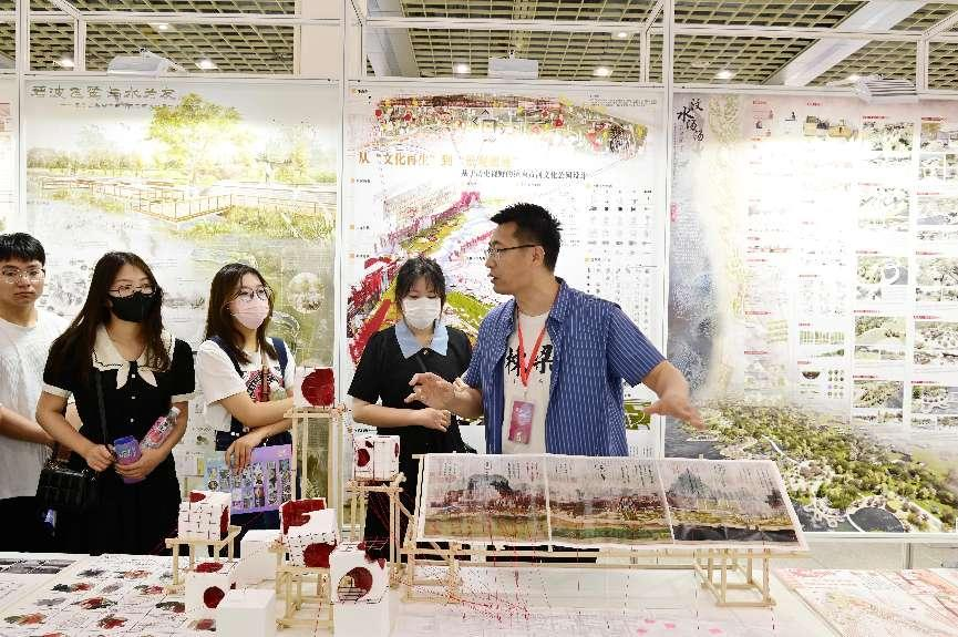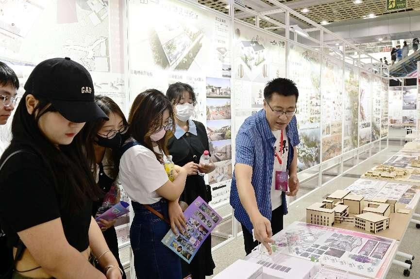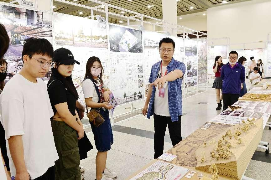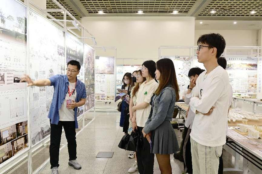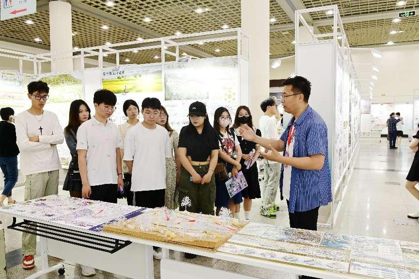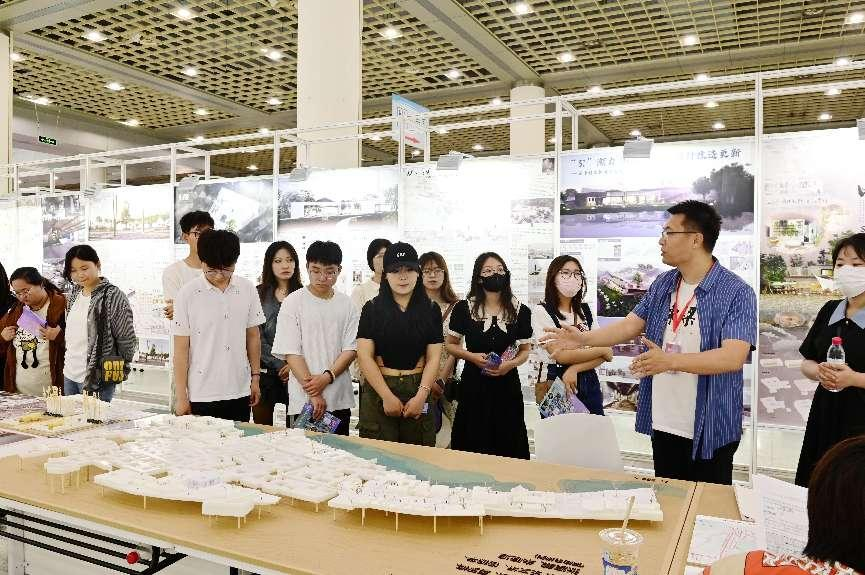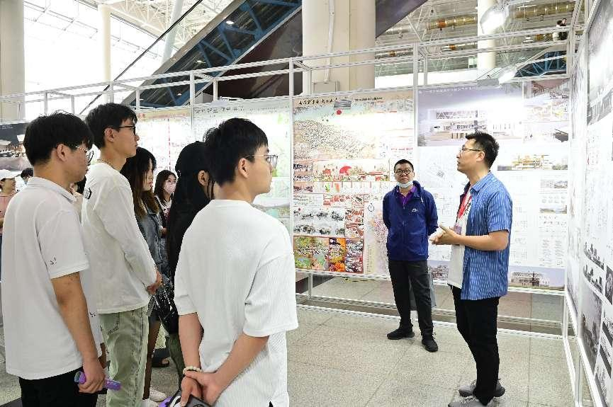 5月19日上午,永利官网设计艺术博览会暨2023届毕业生就业推介会进入第二天。为了更好的丰富课程教学形式,室内设计教研室朱明老师带领建筑与景观设计学院2022级环境设计专业部分学生赴作品展览现场开展课程教学活动。